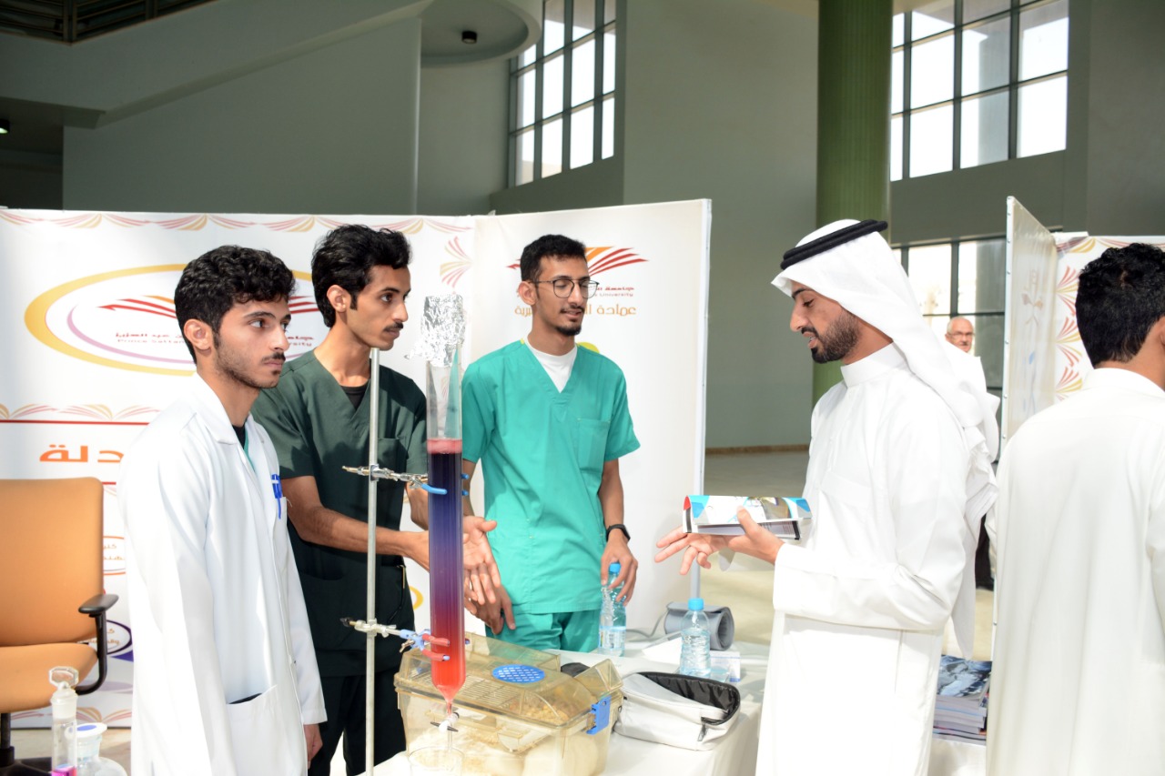 ثم قام الدكتور الخضيري بقص الشريط إيذانا بافتتاح المعرض والمكون من أجنحة لكل كلية ، مقسمة بين المسار الصحي تتمثل في: كلية الطب، وكلية طب الأسنان، كلية العلوم الطبية التطبيقية، وكلية الصيدلة، و المسار الهندسي العلمي والمتمثل في : كلية الهندسة، وكلية هندسة الحاسب وكلية العلوم والدراسات الإنسانية، واستمع سعادته إلى شرح مفصل عن مشاركة كل جناح من خلال المعلومات التي قدمها الطلاب عن كلياتهم لزوار المعرض.