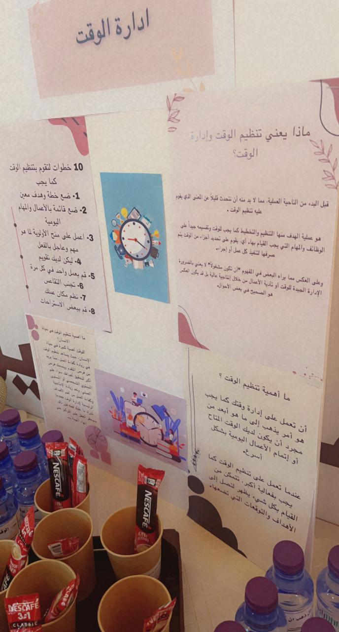 وإيمانًا بأهمية إدارة الوقت أقامت طالبات برنامج البرمجة وعلوم الحاسب فرع الكلية التطبيقية بحوطة بني تميم تحت إشراف د/ هبة الله الويشي أستاذ نظم المعلومات ركن توعوي عن إدارة الوقت بإشراف أ/ هديل آل خريف المحاضر بقسم اللغة الإنجليزية الاثنين 2/6/1444 الموافق 26/12/2022 الساعة العاشرة صباحًا في بهو كلية العلوم والدراسات الإنسانية بحوطة بني تميم. حيث هدف الركن إلى التعريف بمهارة إدارة الوقت وأهميتها بالإضافة إلى إبراز المهارات التي تمكن الطالبات من تنظيم الوقت وجدولة المهام بشكل أكثر فعالية وإنتاجية على المستويين الأكاديمي والشخصي.