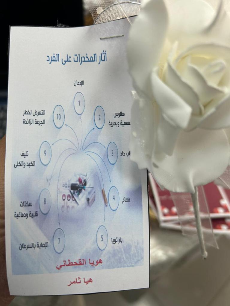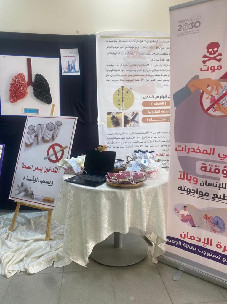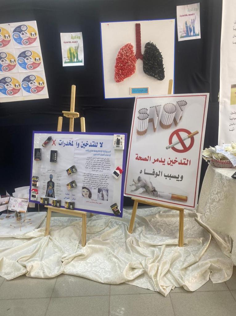 تضمّن المعرض عرضاً مرئياً عن الوقاية من المخدرات و أنواعها قدمته الطالبة أمثال الخولاني، وتم عرض لوحات تعريفية ومنشورات توضح آثار المخدرات على جسم الإنسان و طرق الوقاية منها.