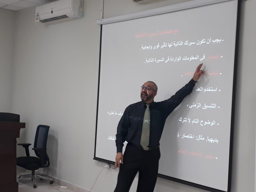 نظمت وحدة الخريجين بكلية التربية بالتعاون مع وحدة الأنشطة يوم الأحد الموافق 12/6/1440 ورشة عمل بعنوان " الكتابة الاحترافية للسيرة الذاتية " قدمها الدكتور محمد عبد القادر على أستاذ مساعد بالكلية ومشرف وحدة الخريجين .