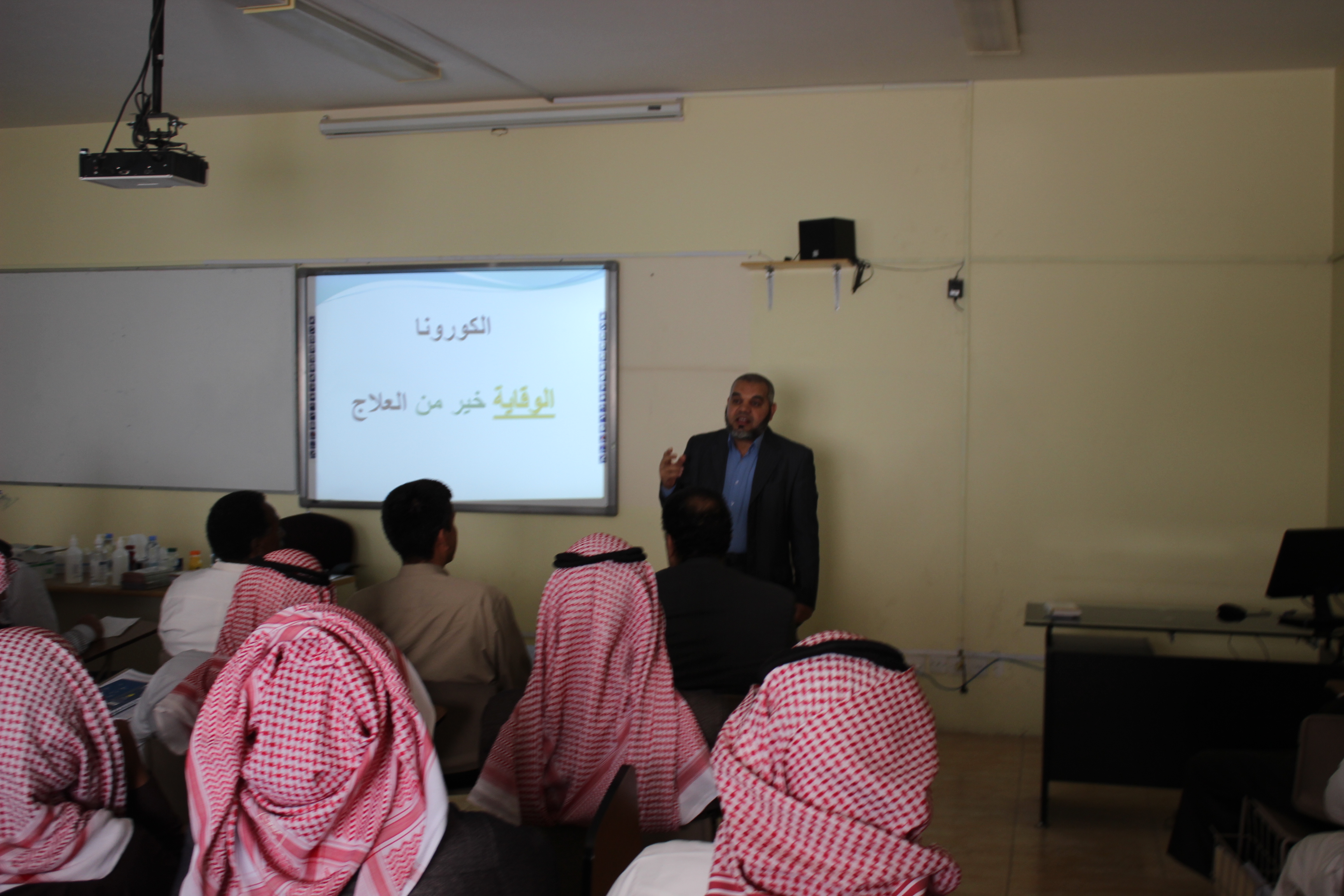 نظمت وحدة النشاط الطلابي بكلية المجتمع بالخرج محاضرة علميّة عن فيروس الكورونا (الأسباب ..وطرق الوقاية)، يأتي هذا في إطار اهتمام كلية المجتمع بالخرج بنشر الوعي الصحي لدى الطلاب ومنسوبي الكلية.قدم المحاضرة الدكتور/ علي رفعت القوصي مشرف التوعية الصحية بمستشفي الملك خالد بالخرج ، وقد تضمن المحاضرة الإشارة إلى خطورة المرض حيث بلغت حالات الإصابة بالفيروس طبقا لإحصائيات وزارة الصحة السعودية بداية من عام 1433هـ حتى تاريخ 12/5/1437هـ (1295) حالة توفي منهم (554) حالة وتماثل للشفاء (741) حالة وقد أشار الدكتور/على رفعت إلى أن من أهم أعراض الإصابة هي الحمي والسعال وضيق وصعوبة التنفس، واحتقان في الحلق والأنف, كما أن الفيروس ينتقل من خلال الإبل المصابة والخفافيش ولمس الأسطح والأدوات الملوثة بالفيروس، والرذاذ المتطاير في أثناء الكحة أو العطس. كما أن من أهم طرق الوقاية من الفيروس هي المداومة على غسل اليدين جيدًا بالماء والصابون، وتجنب ملامسة العينين والأنف والفم باليد,وتجنب الاحتكاك بالمصابين، ولبس الكمامات الواقية، والحفاظ على العادات الصحية السليمة.