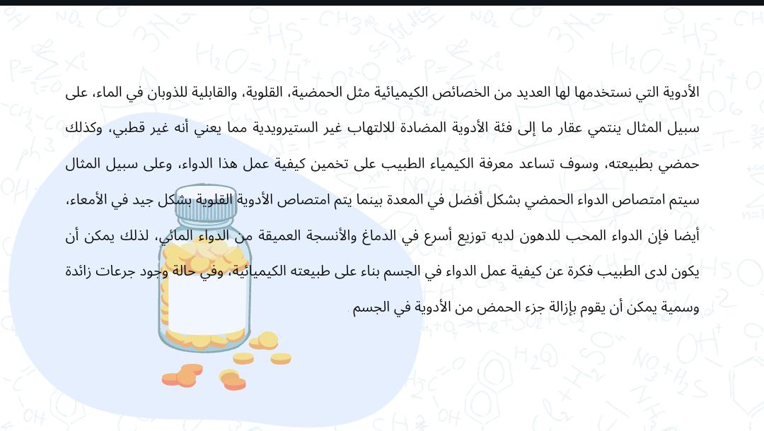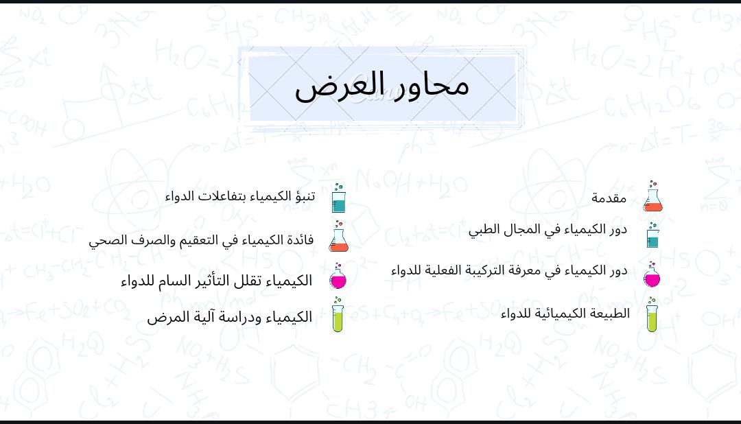 الكيمياء الطبية هي تخصص كيميائي يهتم بابتكار واكتشاف العقاقير العلاجية، وكذلك تطويرها، وتصنيعها. لذلك نظم نادي العلوم الأساسية بعمادة السنة التحضيرية نشاط بعنوان " الكيمياء الطبية " يوم الأحد الموافق 1443/8/24هـ،تقديم طالبات صحي المستوى الثاني بالعمادة تحت إشراف الدكتورة حنان فراج. وقد اشتمل النشاط على عدة أهداف منها:- دور الكيمياء في المجال الطبي وكيفية تأثير المواد الكيميائية المختلفة على الأنظمة البيولوجية سواء البشرية، أو الحيوانية. و ابتكار عقاقير جديدة، وتطوير تركيبات دوائية لتوصيل المواد الفعالة بيولوجياً. كما وضحت الصيغة الكيميائية للدواء، كما اشتمل النشاط على تنبوء الكيمياء بتفاعلات الدواء داخل جسم الكائن الحي ( التفاعلات الدوائية). كما تضمن النشاط فوائد الكيمياء في التعقيم وإنها تقلل من التأثير السام للدواء. كما تم توضح علاقة الكيمياء و دراسة آلية المرض. وبالنهاية شارك الحضور فى مناقشة تفاعلية و لاقى النشاط تفاعلاً مثمراً.