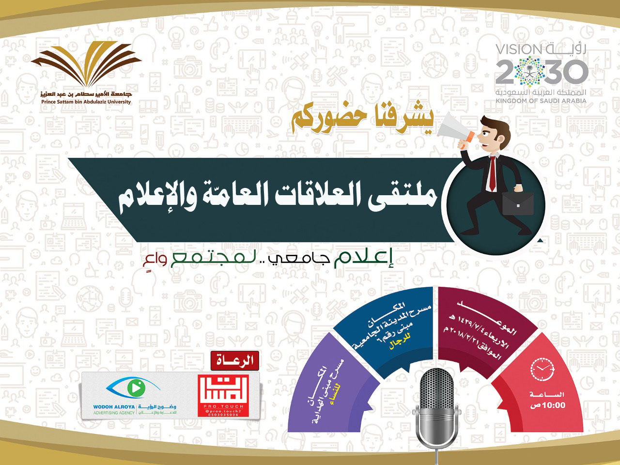 أعلنت الإدارة العامة للعلاقات العامّة والإعلام بجامعة الأمير سطّام بن عبد العزيز وبرعاية كريمة من معالي مدير الجامعة الأستاذ الدكتور عبد العزيز بن عبد الله الحامد انطلاق الملتقى الإعلامي للعلاقات العامة والإعلام، تحت عنون (إعلام جامعي .. لمجتمع واعٍ) والذي يتضمن العديد من الفقرات والفعاليات، ومعرضًا مصاحبًا يحكي قصة الجامعة منذ نشأتها إلى الآن، والإشارة إلى جهود الإدارة العامة للعلاقات العامة والإعلام في تفعيل وسائل الإعلام الجديد لنقل الحدث لحظة بلحظة عبر استخدام كل هذه الوسائل وتسخيرها لخدمة العملية التعليمية، وتكريم كوكبة من المنسقين الإعلامين الذين كان لهم دور بارز ومهم في نقل الأخبار والفعاليات من كافّة وحدات الجامعة المختلفة، وذلك في تمام العاشرة صباح يوم الأربعاء 4/ 7/ 1439هـ الموافق 21/3/2018م، على مسرح المدينة الجامعية مبنى رقم (6) للرجال، ومسرح مبنى الهداية للنساء.