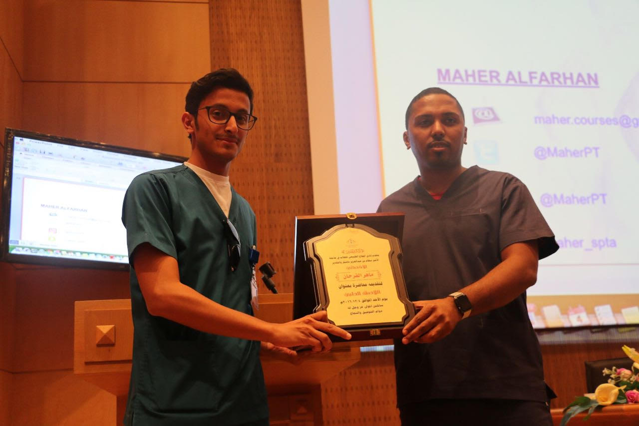 وفي الختام شكر نادي العلاج الطبيعي الاخصائي/ ماهر الفرحان لقبوله الدعوة وتقديمه المحاضرة المميزة وتم تقديم درع تذكاري له مع تمنياتنا له بالتوفيق و السداد