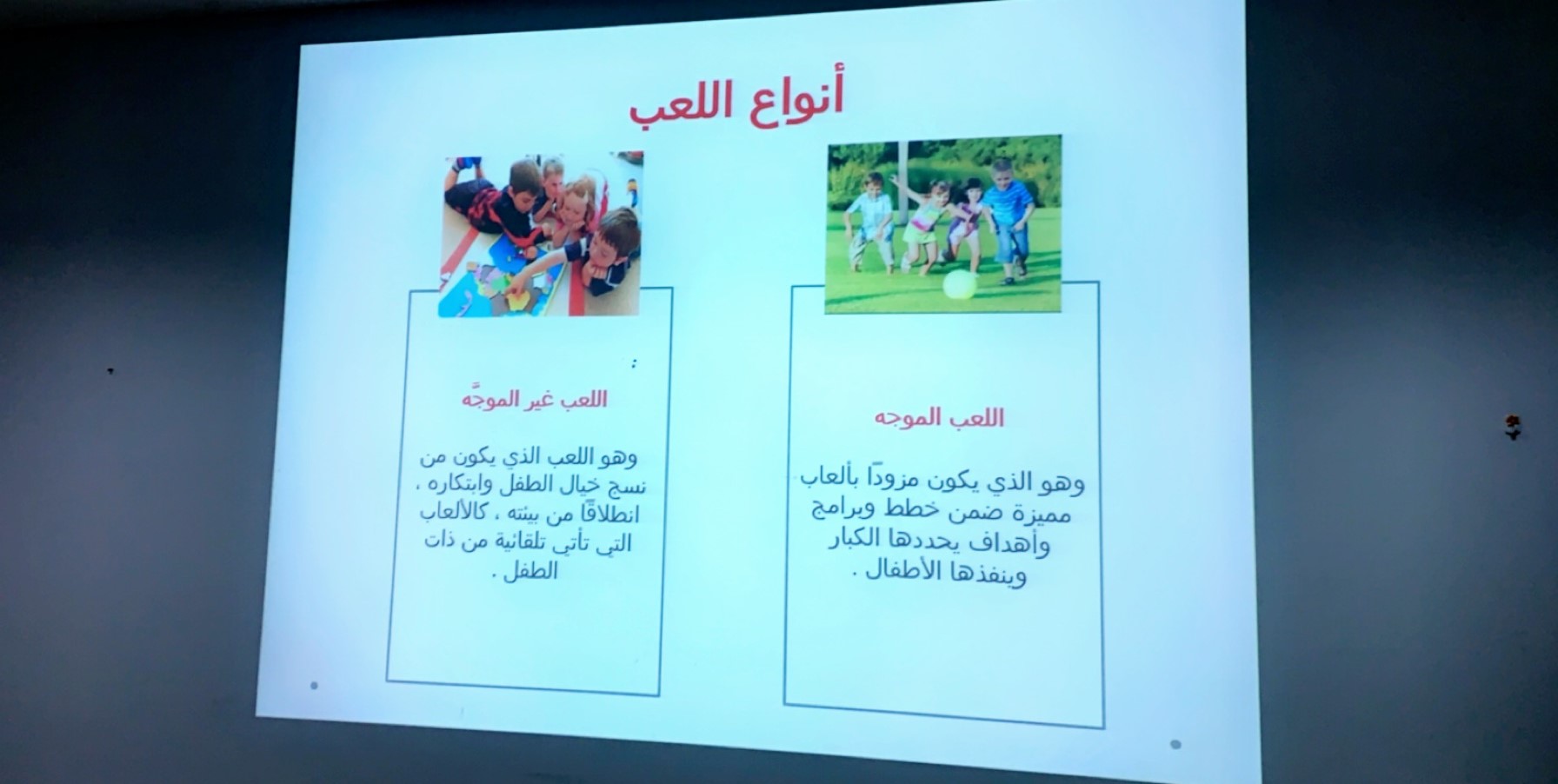أقام قسم رياض الأطفال بالتعاون مع وحدة النشاط الطلابي يوم الخميس7/7/1440هـ, دورة بعنوان: (اللعب مفتاح التعلم) للأستاذة/ فادية الحازمي، وقد تناولت عددا من المحاور منها: ماهية اللعب؟، وأنواع اللعب, وفوائد استخدام أسلوب التعلم باللعب, والشروط الواجب توفرها في الألعاب التربوية, ودور المعلم في أسلوب التعلم باللعب, والتخطيط للألعاب التربوية بناءً على منهج التعلم الذاتي لرياض الأطفال، وهدفت الدورة للتعرف على أهمية اللعب في التعلم, وهل اللعب حاجة أم ترف؟, وهل للعب دور واضح في نمو الطفل؟ وهل اللعب مصدر تسلية أم وسيلة تعلم ؟