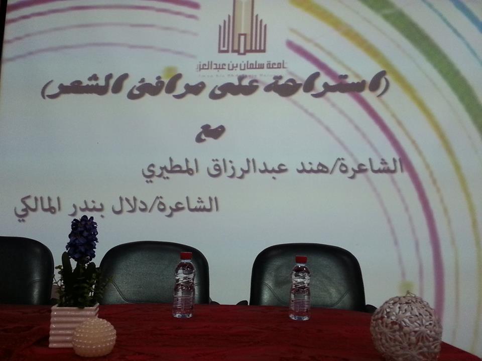 أقام قسم اللغة العربية بكلية العلوم والدراسات الإنسانية بحوطة بني تميم أصبوحة شعرية وذلك ضمن حملة تعزيز القيم الوطنية (وطننا أمانة) من خلال استضافة الشاعرتين المتألقتين د. هند المطيري من جامعة الملك سعود، والأستاذة دلال المالكي من جامعة شقراء، وأدارت اللقاء د. حصة الهزاني .بدأت الأصبوحة بأنشودة ترحيبية للشاعرتين وللحضور الكريم، ثم تلا ذلك تلاوة آيات من الذكر الحكيم رتلتها على مسامع الحضور الطالبة/ أشواق العنزي وبدأت الأصبوحة بتقديم الدكتورة حصة الهزاني الشاعرتين للحضور بتقدم سيرة ذاتية لكل منهما ثم ولجن إلى عالم الشعر من خلال جولات شعرية عذبة بين الشاعرتين، أثارت في الحضور الكريم مشاعر الحب والولاء لوطن الخير والعطاء ، و ربط الأجيال المعاصرة بمجد المملكة و تاريخها العاطر الحافل بالانتصارات ،فبدأت تقول الشاعرة هند المطيري في قصيدتها ولاء و وفاء :