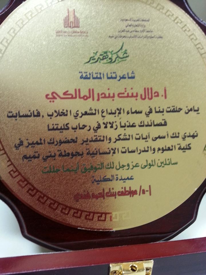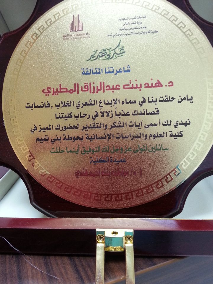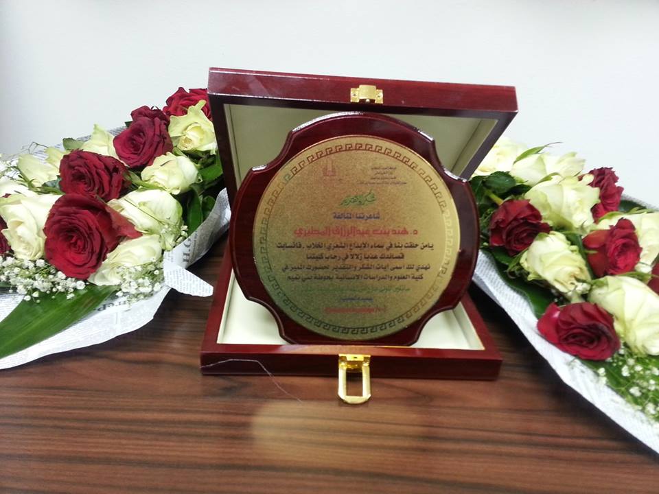 وقد لاقت الأصبوحة استحسان جميع الحضور من الطالبات ومنسوبات الكلية، وأنهت الأصبوحة د. حصة الهزاني بكلمة شكر رقيقة للشاعرتين وختمت اللقاء بكلمات شكر من عميدة الكلية أ. د. عواطف بنت أحمد هندي للشاعرتين والقائمين على هذا اللقاء، وتم تكريم الشاعرتين من قبل عميدة الكلية وأبدى الجميع شكره واستحسانه على حسن الاتنظيم والاستقبال من قبل طالبات القسم ومنهن الطالبة ندى السطحي وأشواق العنزان والجوهرة ونوره المظبي وهيا على جهدهن في ذلك.