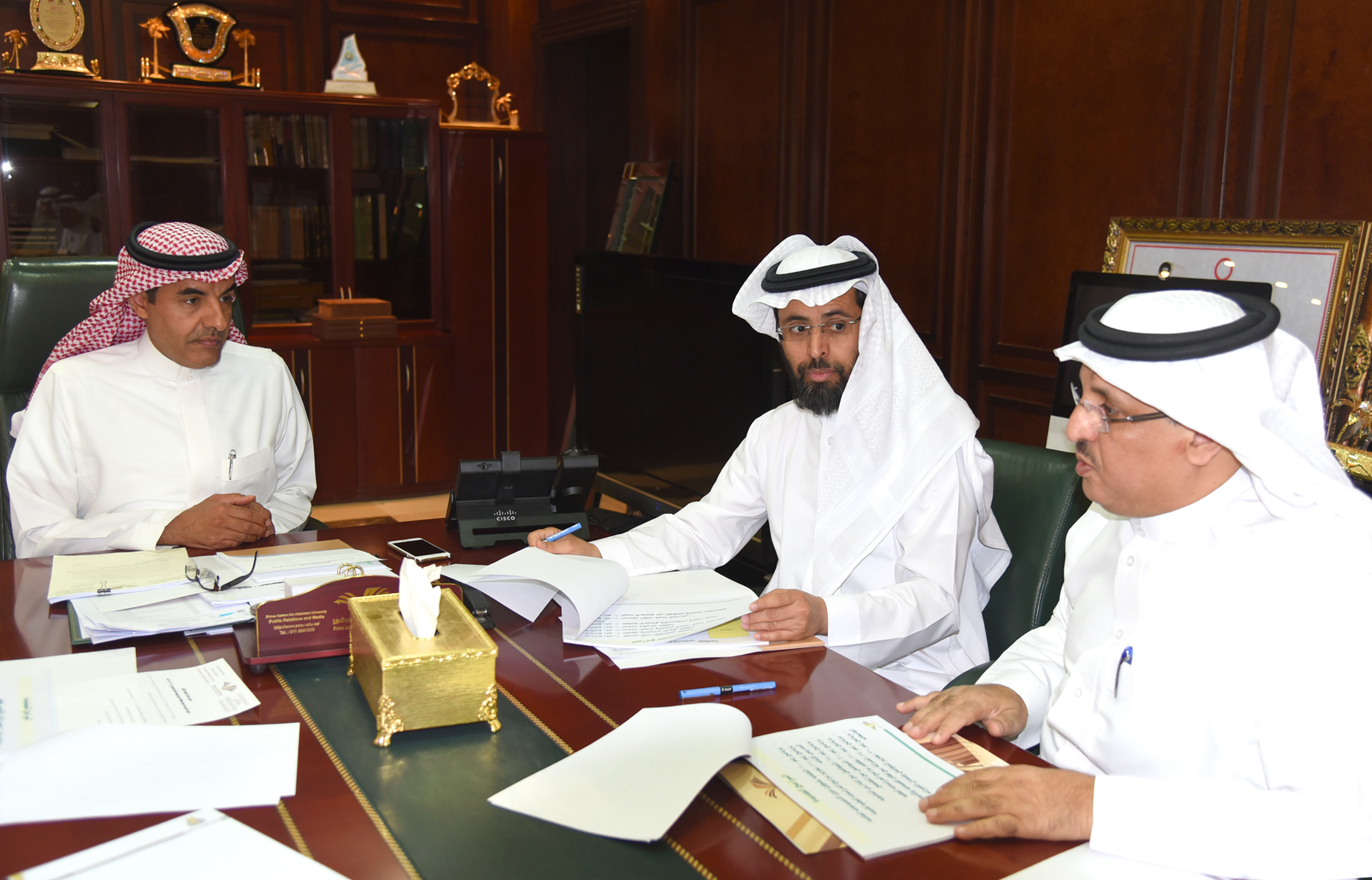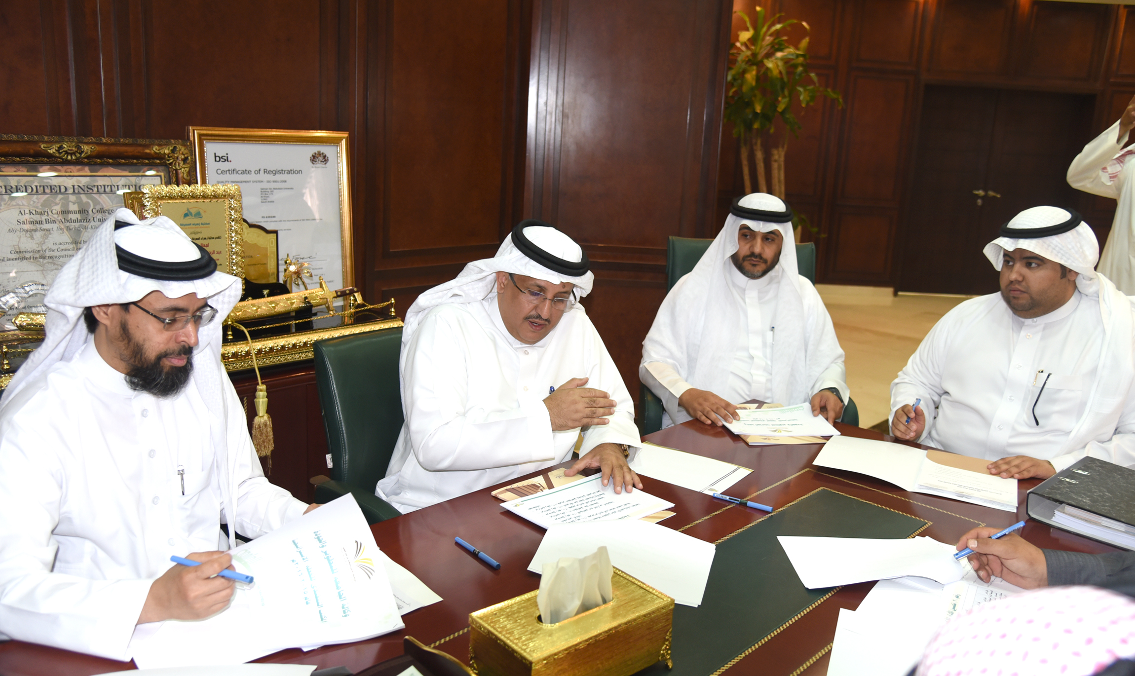 عقدت اللجنة الإشرافية العليا للخطة الاستراتيجية اجتماعها الأول برئاسة معالي مدير الجامعة الدكتور عبدالرحمن العاصمي وبحضور أعضاء اللجنة مكونة من سعادة وكلاء الجامعة في مكتب معاليه بالمدينة الجامعية في السيح,في بداية الاجتماع استمع معاليه عن تقرير الجامعة بخطة آفاق للعام 2015-2016, وتقرير البرامج التنفيذية لخطة آفاق, ونتائج الاستبانات للقيادات وأعضاء هيئة التدريس والطلاب, ونتائج جمع البيانات حول الجامعة, كما تم اعتماد عدداً من التوصيات.