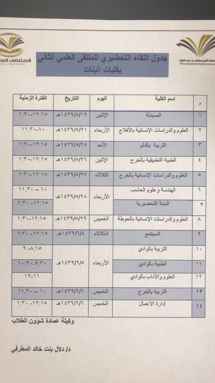 نظمت كلية الصيدلة الملتقى التحضيري للملتقى العلمي الثاني يوم الأثنين ١٤٣٩/٥/١٩ بحضور اللجنة الإشرافية للملتقى العلمي الدكتورة دلال المطرفي والأستاذة ناهد أبو زيد استهل الملتقى بتلاوة آيات من الذكر الحكيم ثم عرض مرئي يبين استعدادات الكلية لهذا الملتقى بعد ذلك القت وكيلة الكلية الدكتورة أماني عواد كلمة ترحيبية وأكدت اهتمام الكلية بهذا الملتقى وحرصها على نجاحه ثم القت وكيلة عمادة شؤون الطلاب عضو اللجنة الإشرافية للملتقى الدكتورة دلال المطرفي كلمة اثنت فيها على الجهود التي تبذلها القيادات بالكليات ومنسوبيها للمشاركة في الملتقى وحثت الجميع على بذل المزيد من هذه الجهود لتتقدم الجامعة إلى مصاف الجامعات العريقية في البحث العلمي والابتكاري و المهاري ودعت الطالبات إلى مزيد من التميز والإبداع كما تضمن الملتقى نبذة عن جهود لجنة الملتقى بالكلية والتي كان يتزعمها عضوات المجلس الطلابي اختتم الملتقى بتكريم الفائزات ثم توجه الحضور لزيارة المعرض المصاحب الجدير ذكره أن هذا الملتقى يعد المحطة الأولى للفريق النسائي باللجنة الإشرافية يليه بإذن الله باقة من الملتقيات التحضيرية على مستوى كليات البنات بالجامعة .