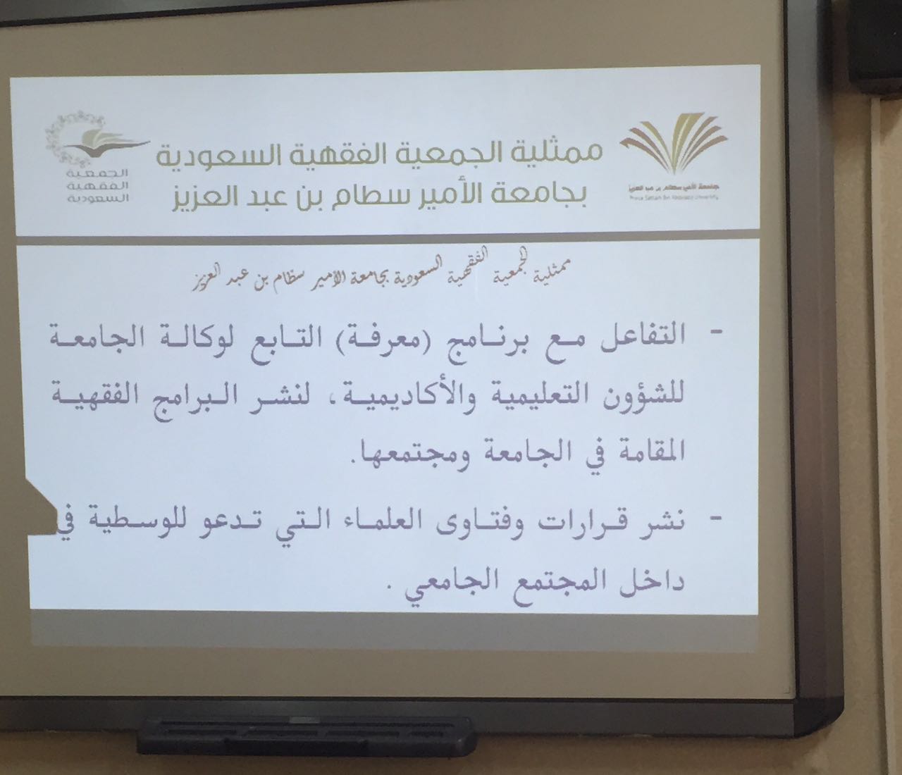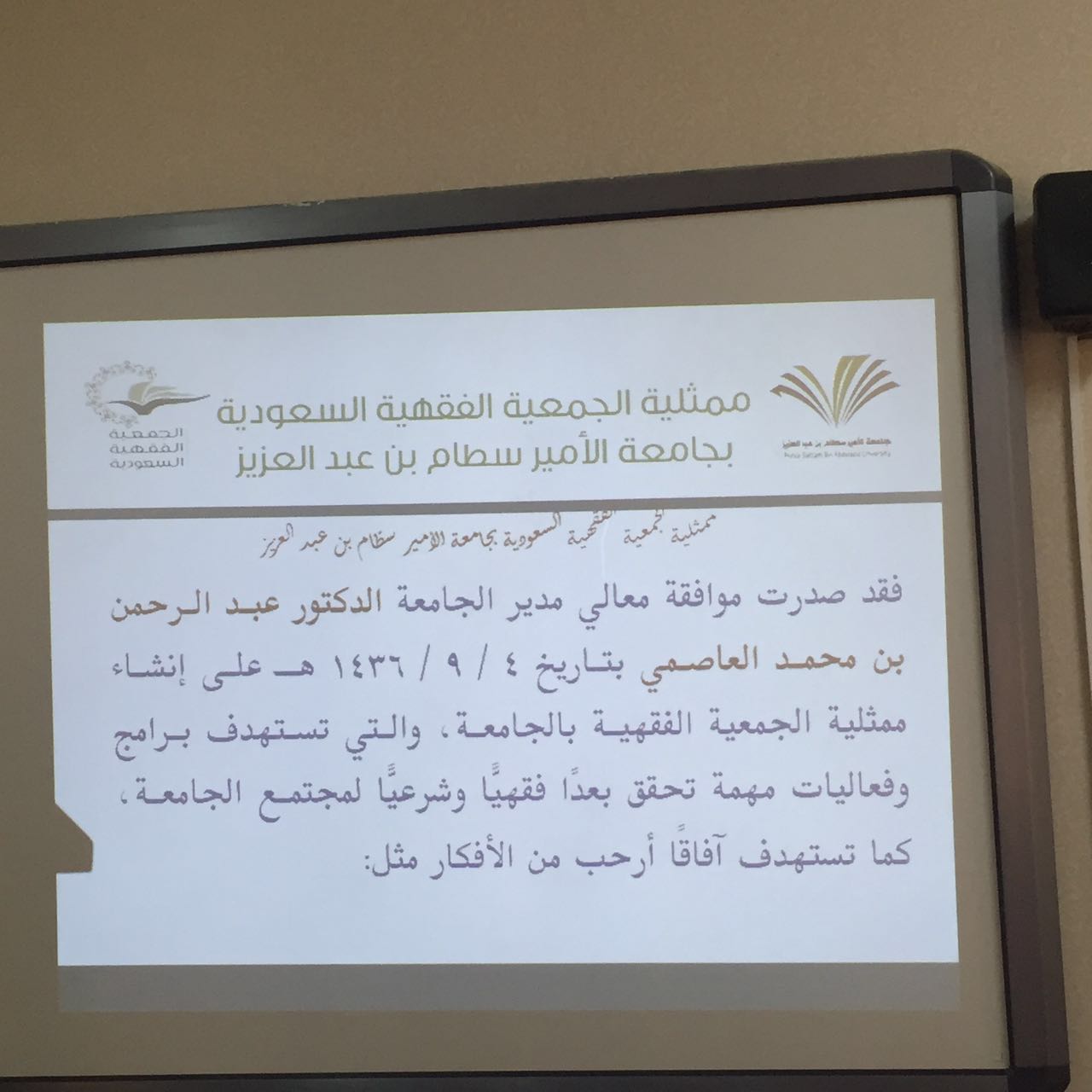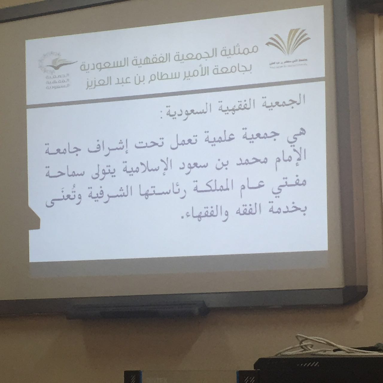 بدأت ممثلة اللجنة النسائية لممثلية الجمعية الفقهية د.ابتهال المبرد بتقديم الشكر والتقدير لمعالي مدير الجامعة وسعادة وكيل الجامعة للدراسات العليا والبحث العلمي على افتتاح الجمعية والإشراف عليها ، تلي ذلك مقدمة تعريفية للحضور عن الجمعية الفقهية السعودية : بأنها جمعية علمية تعمل تحت إشراف جامعة الإمام محمد بن سعود الإسلامية يتولي سماحة مفتي عام المملكة رئاستها الشرفية وتعني بخدمة الفقه والفقهاء ، وقد صدرت موافقة كريمة من معالي مدير الجامعة د.عبدالرحمن العاصمي بتاريخ 4/9/1436هـ على إنشاء ممثلية الجمعية الفقهية بالجامعة ، والتي تستهدف برامج وفعاليات مهمة تحقق بعداً فقهياً وشرعياً لمجتمع الجامعة كما تستهدف آفاقا أرحب من الأفكار مثل : تأسيس النادي الفقهي بالجامعة والذي يتبع عمادة شؤون الطلاب ويهدف إلى نشر الوعي بالفقه الأخلاقي والوسطي بين منسوبي الجامعة ، تنظيم الندوات والدورات وورش العمل التدريبية بالتعاون مع عمادة خدمة المجتمع والتعليم المستمر، ومعهد الأمير عبد الرحمن بن ناصر للدراسات الاستشارية، التفاعل مع برنامج (معرفة) التابع لوكالة الجامعة للشؤون التعليمية والأكاديمية، لنشر البرامج الفقهية المقامة في الجامعة ومجتمعها، نشر قرارات وفتاوى العلماء التي تدعو للوسطية في داخل المجتمع الجامعي ، العمل على إنشاء برامج توعوية لتحذير شباب المجتمع الجامعي والناشئة من الفكر الضال والتمسك بمنهج الوسطيّة والاعتدال، ربط الشباب الجامعي بولاة الأمر وهيئة كبار العلماء، دراسة النوازل والمستجدات الفقهية بمشاركة أساتذة الفقه بالجامعة،العمل على إنتاج بحوث فقهية ذات صلة بمجتمع الجامعة.