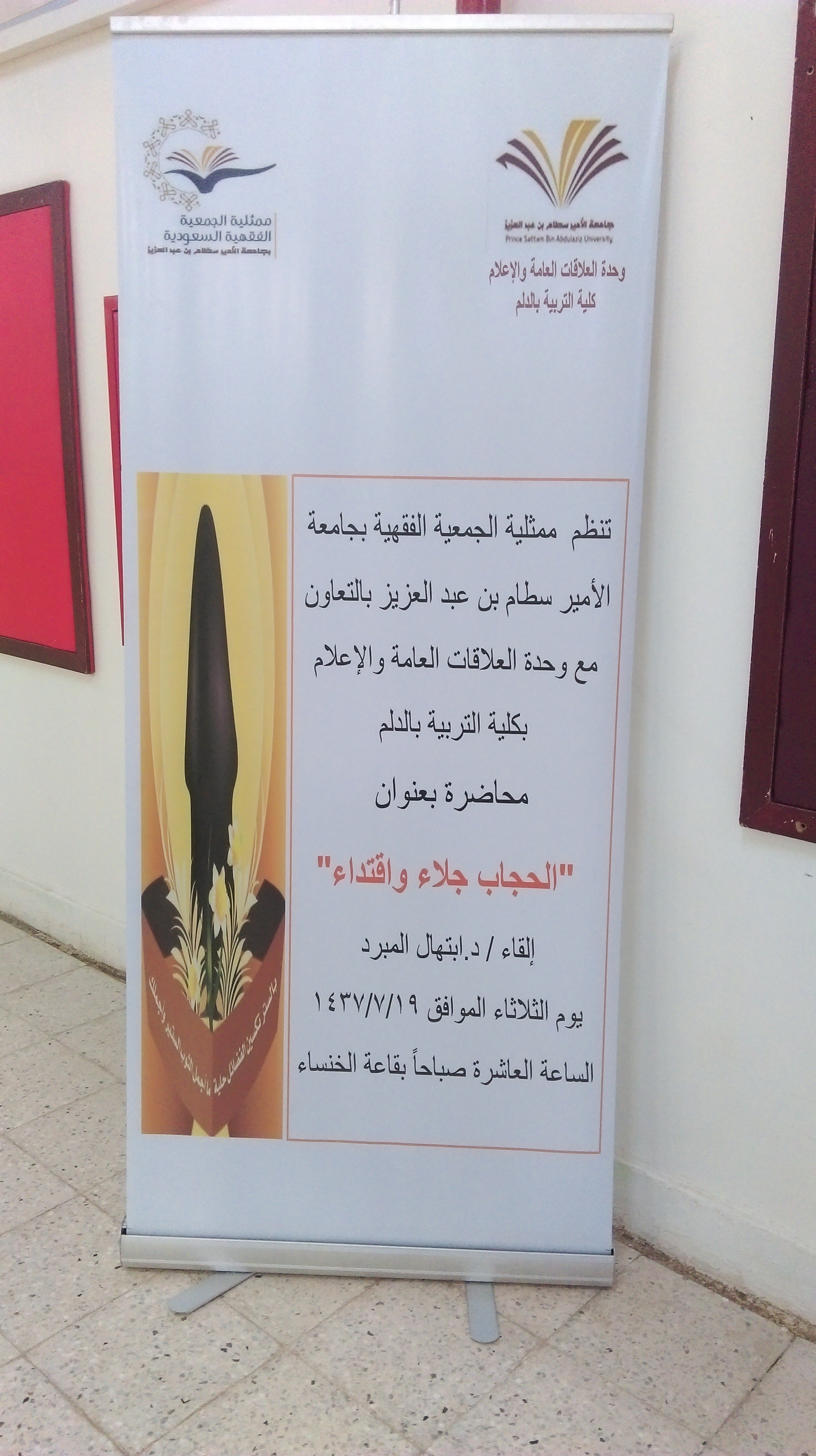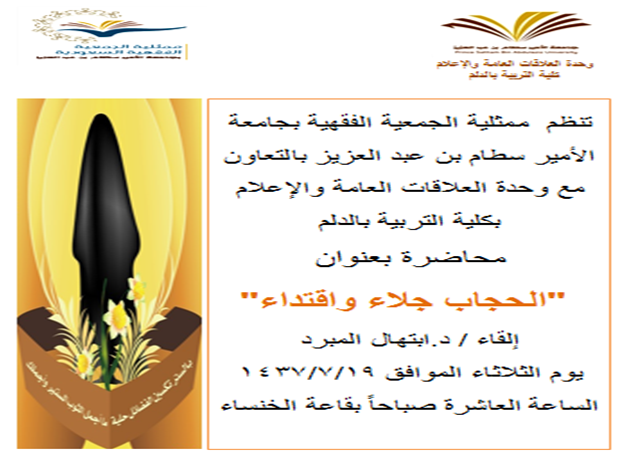 تحت رعاية عميدة كلية التربية بالدلم د.حنان الجهني ، افتتحت اللجنة النسائية لممثلية الجمعية الفقهية السعودية بالجامعة بالتعاون مع وحدة العلاقات العامة والإعلام بالكلية أنشطتها بمحاضرة عن الحجاب ( الحجاب جلاء واقتداء) إلقاء د. ابتهال المبرد أستاذ الفقه المساعد بقسم الدراسات الإسلامية ، و ممثلة اللجنة النسائية بالممثلية الجمعية الفقهية السعودية بجامعة سطام بن عبد العزيز يوم الثلاثاء الموافق 19/7/1437هـ بقاعة الخنساء.