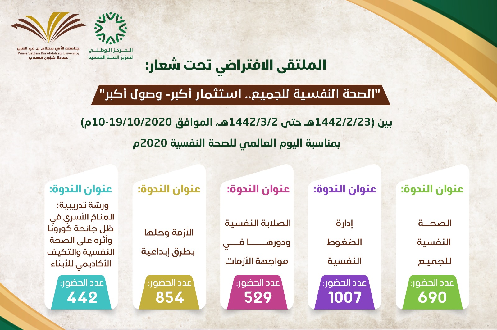 في إطار جهود الجامعة الملموسة في خدمة المجتمع؛ نظمت اللجنة التنفيذية لمجموعة تعزيز الصحة النفسية بالجامعة برئاسة سعادة الدكتور ثلاب بن عبدالله الشكرة(عميد شؤون الطلاب) الملتقى الافتراضي الأول لأعمال اللجنة تحت شعار:"الصحة النفسية للجميع.. استثمار أكبر- وصول أكبر" وذلك بمناسبة اليوم العالمي للصحة النفسية 2020م، وقد أقيم الملتقى في الفترة بين (23/2/1442هـ حتى 2/3/1442هـ، الموافق 10-19/10/2020م)، وتضمن عدداً من الدورات والورش التدريبية قدمهاثلة متميزة من كوادر الجامعة، وقد لاقت قبولاً واسعاً، وحضوراً ملفتاً، حيث زاد عدد الحضور في الملتقى على (3500) مستفيد من خارج الجامعة وداخلها، بلغت نسبة الضيوف من خارج الجامعة 70% من المستفيدين، وكانت نسبة طلاب وطالبات الجامعة 23%، و7% من منسوبي الجامعة.
