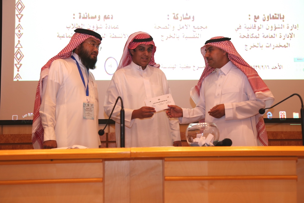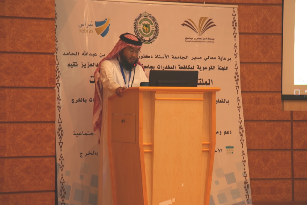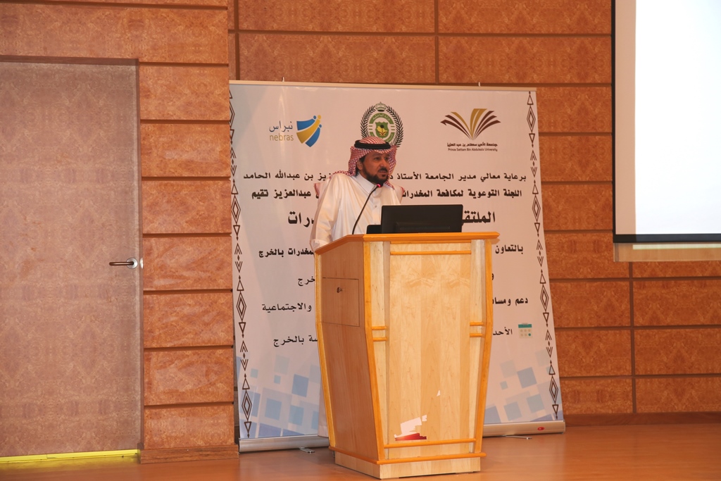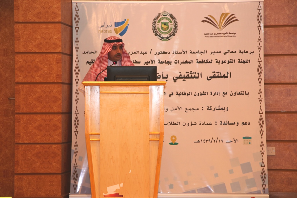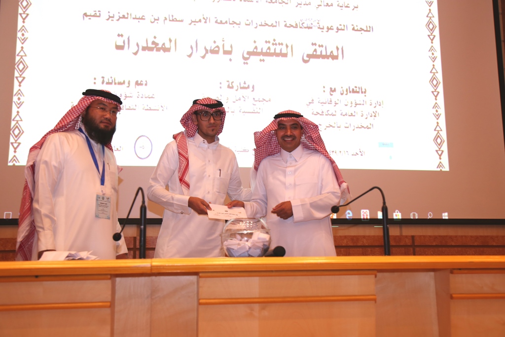 برعاية معالي مدير جامعة الأمير سطام بن عبدالعزيز وبدعم ومساندة عمادة شؤون الطلاب أقامت اللجنة التوعوية لمكافحة المخدرات بالجامعة الملتقى التثقيفي بأَضرار المخدرات، وذلك يوم الأحد الموافق 16/2/1439هـ في مسرح كلية الهندسة بالخرج، في تمام العاشرة صباحاً، وذلك ضمن إطار البرامج التوعوية والتثقيفية المتنوعة للجنة عن أضرار المخدرات وتأثيرها، وكان الملتقى بالتعاون مع إدارة الشؤون الوقائية بالإدارة العامة لمكافحة المخدرات بالخرج.