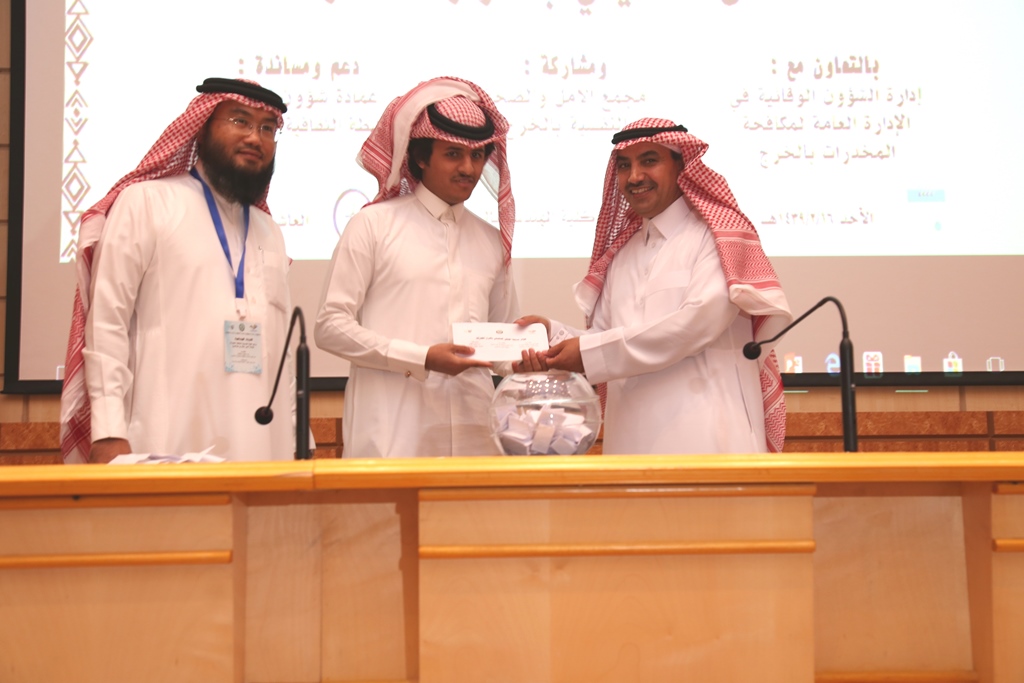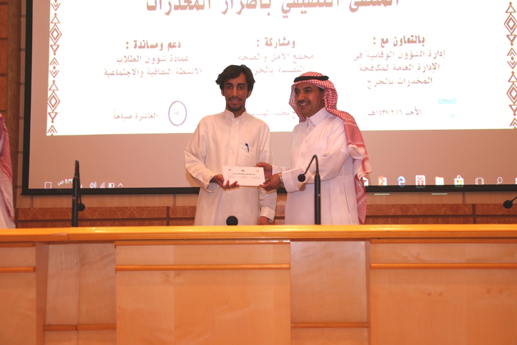 تلا ذلك عرضاً تقديمياً عن أضرار المخدرات وتأثيرها على الإنسان، قدمه الدكتور/ محمد بن حسين القيسي، عضو اللجنة التوعوية لمكافحة المخدرات بالجامعة، حيث أوضح باختصار وتركيز أنواع المخدرات المنتشرة عالمياً، والأنواع المنتشرة في المملكة، وذكر كذلك النسب والإحصائيات المفجعة للمدمنين حول العالم، كما بيّن الجهود الكبيرة التي تقوم بها المملكة لمحاربة هذه الآفة الخطيرة والقضاء على المروجين والمهربين لها، وبخاصة ما تقوم به الإدارة العامة لمكافحة المخدرات، واللجنة الوطنية لمكافحة المخدرات (نبراس).