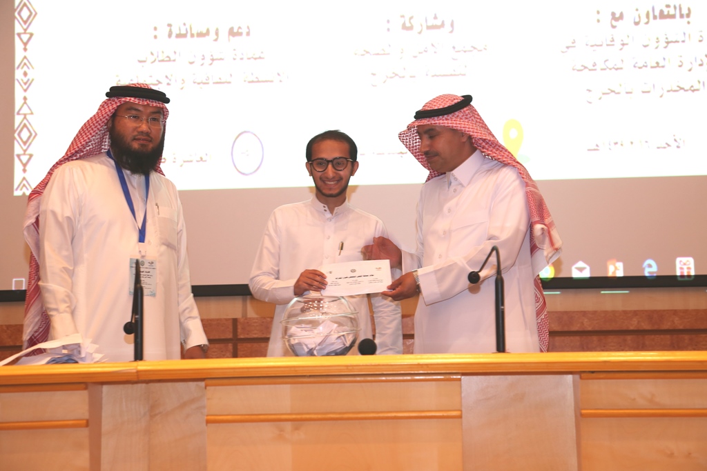 بعدها تم السحب على مجموعة جوائز متعلقة بالمسابقة التي طرحت في موقع حفل الملتقى، وسلمت الجوائز النقدية للطلاب الفائزين.