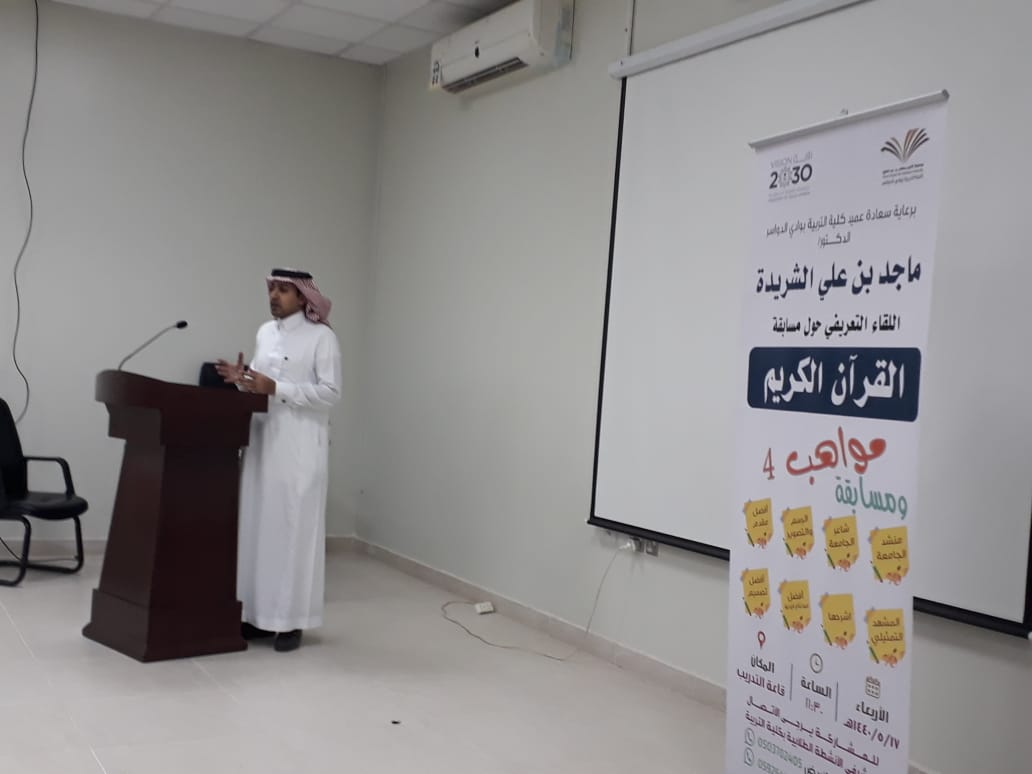 أقامت وحدة الأنشطة الطلابية بكلية التربية بوادي الدواسر فعالية اللقاء التحضيري الثالث لمسابقة مواهب4 بحضور عميد الكلية التربية د. ماجد بن علي الشريدة د. حسام محمود زكي، منسق الوحدة والأستاذ المساعد في قسم التربية الخاصة بكلية التربية بالوادي – جامعة الأمير سطام بن عبد العزيز يوم (الاثنين 29/ 5 / 1440هــ 4/2/ 2019م)،