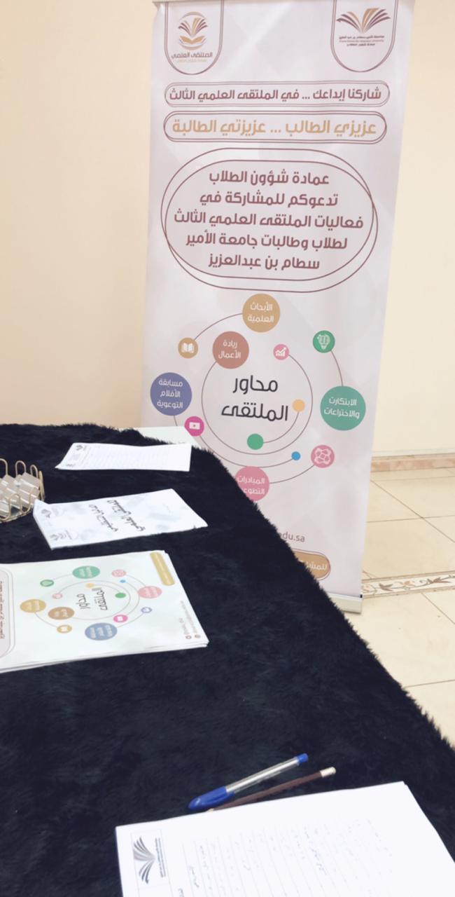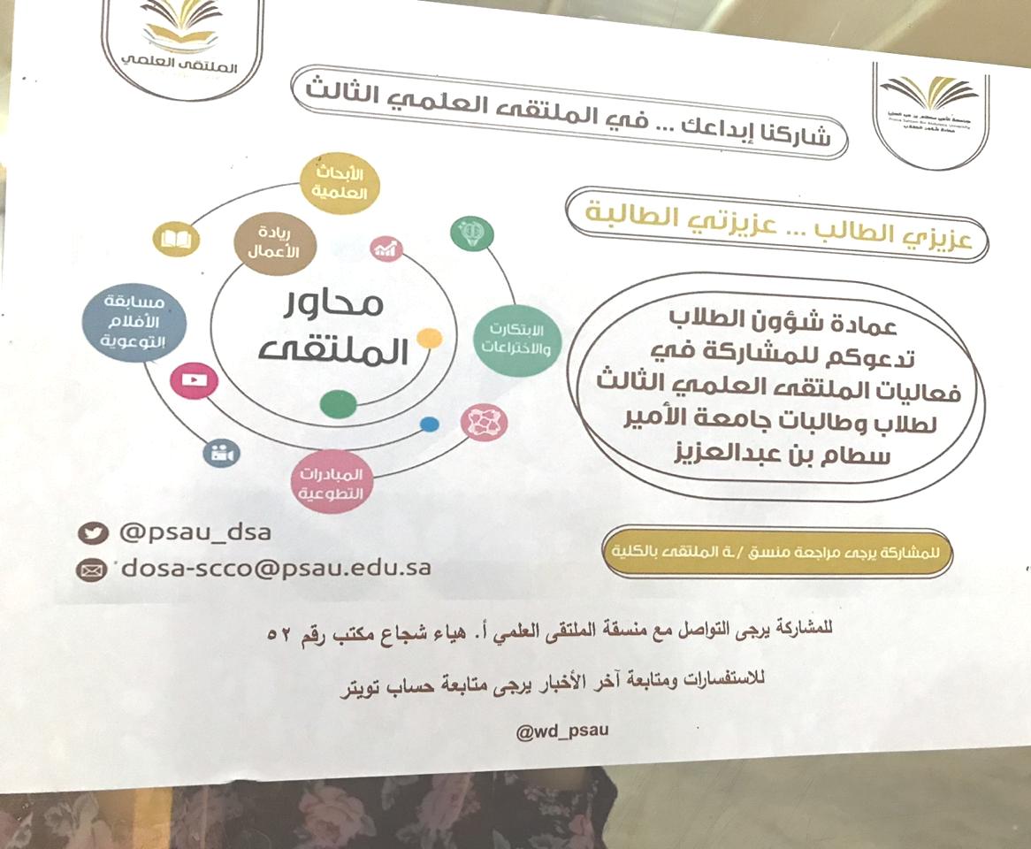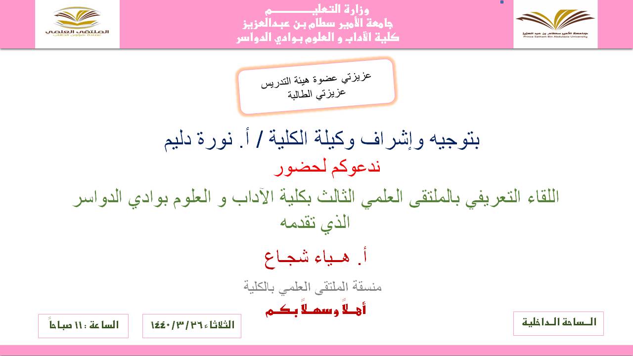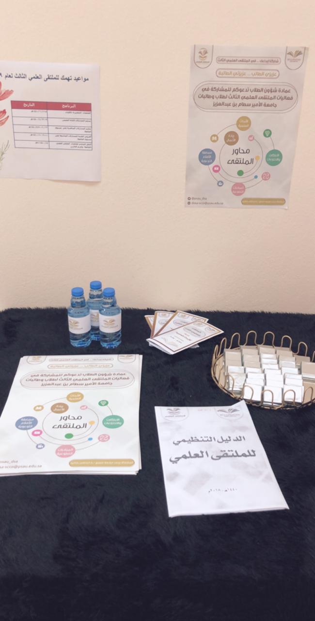 بحضور وكيلة الكلية للشؤون الاستاذة نوره دليم وعدد من عضوات هيئة التدريس والطالبات عقدت كلية الآداب والعلوم بوادي الدواسر شطر الطالبات ، لقاءً تعريفياً بالملتقى العلمي الثالث الذي تنظمه عمادة شؤون الطلاب بالجامعة للطلاب والطالبات خلال العام الجامعي الحالي .