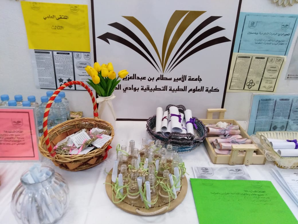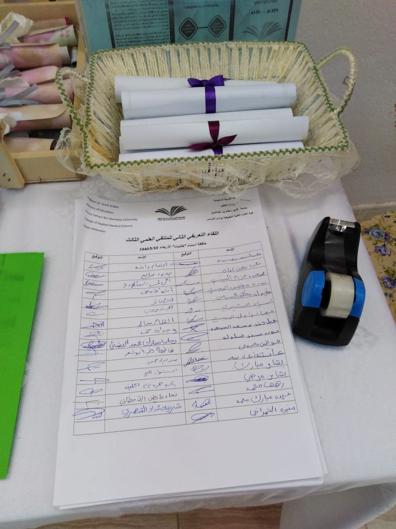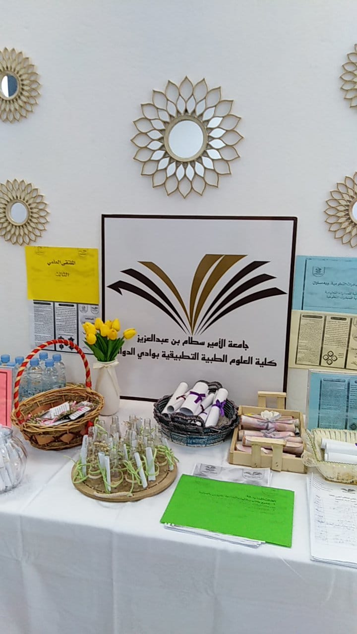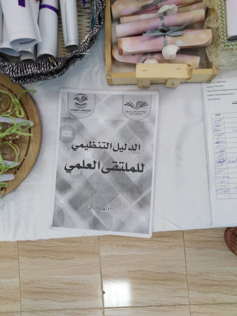 أقيم اللقاء التعريفى الثانى للملتقى العلمى الثالث للطالبات وأعضاء هيئة التدريس بكلية العلوم الطبية التطبيقية بوادى الدواسر تحت رعاية سعادة مشرف الكلية دكتور ماجد الشريدة والذي استمر على مدار يومي الاربعاء والخميس١٠و ١١ من الشهر الحالى وقد اشتمل على إلقاء محاضرة للطالبات عن الملتقى و محاور وضوابط وجوائز ومواعيد اللقاء التحضيرى والتسليم والتحكيم كما تم تشكيل لجان من أعضاء هيئة التدريس لكل محور مع ولجنة تنظيمية ولجنة للإعلام والاعلان وكذلك تم توزيع الدليل الخاص بالملتقى على جميع أعضاء هيئة التدريس وتوزيع نسخ منه للطالبات للإطلاع وجارى ترجمته إلى اللغة الإنجليزية.وتم توزيع منشورات بالمحاور والجوائز لتحفيز الطالبات على المشاركة .