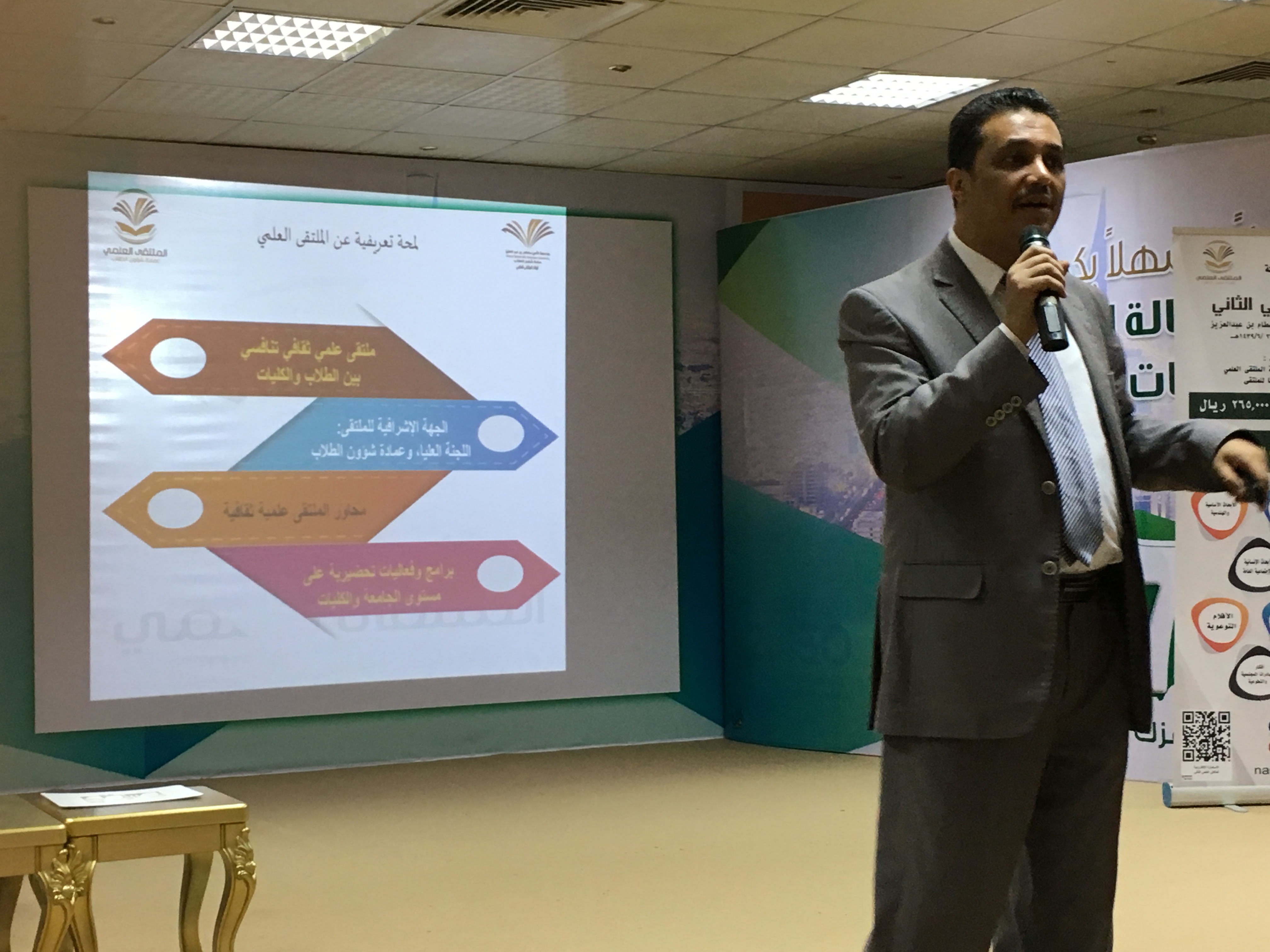 وقدم الأبيض العرض التعريفي عن الملتقى العلمي الثاني ، مبيناً ماهيته ومعرفاً بأهداف تنظيم الجامعة له من حيث رفع المستوى العلمي والثقافي لدى الطلاب ، وتطوير مواهبهم وقدراتهم ، والاستفادة من طاقاتهم ، حتى يتخرجوا من الجامعة بشخصيات متكاملة نافعة للوطن والمجتمع .