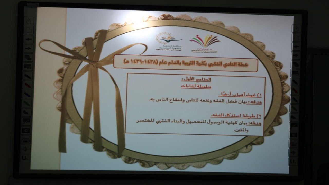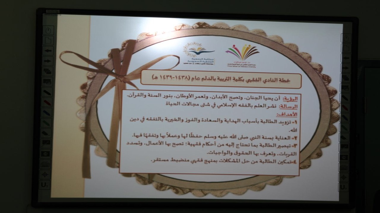 بعون الله نظم النادي الفقهي بكلية التربية بالدلم , بالتعاون مع ممثلية الجمعية الفقهية السعودية بجامعة الأمير سطام لقاءًا تعريفيًا تحت إشراف د. ابتهال المبرد رئيسة قسم الدراسات الإسلامية , وممثلة الجمعية الفقهية السعودية بالجامعة ومشرفة النادي الفقهي بالكلية , و بحضور أعضاء النادي من الطالبات، وأعضاء هيئة التدريس بقسم الدراسات الإسلامية المشاركات في تنفيذ برامج النادي ,و ذلك يوم الأحد الموافق 16/2/1439هـ.