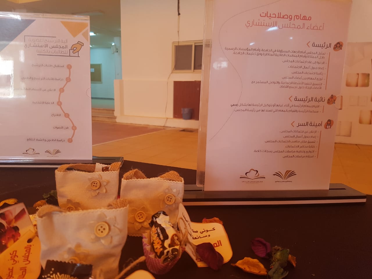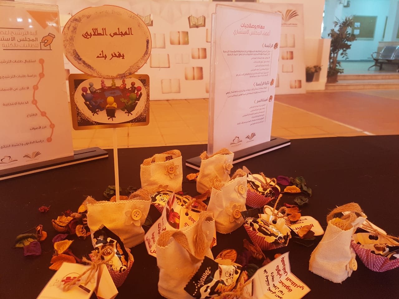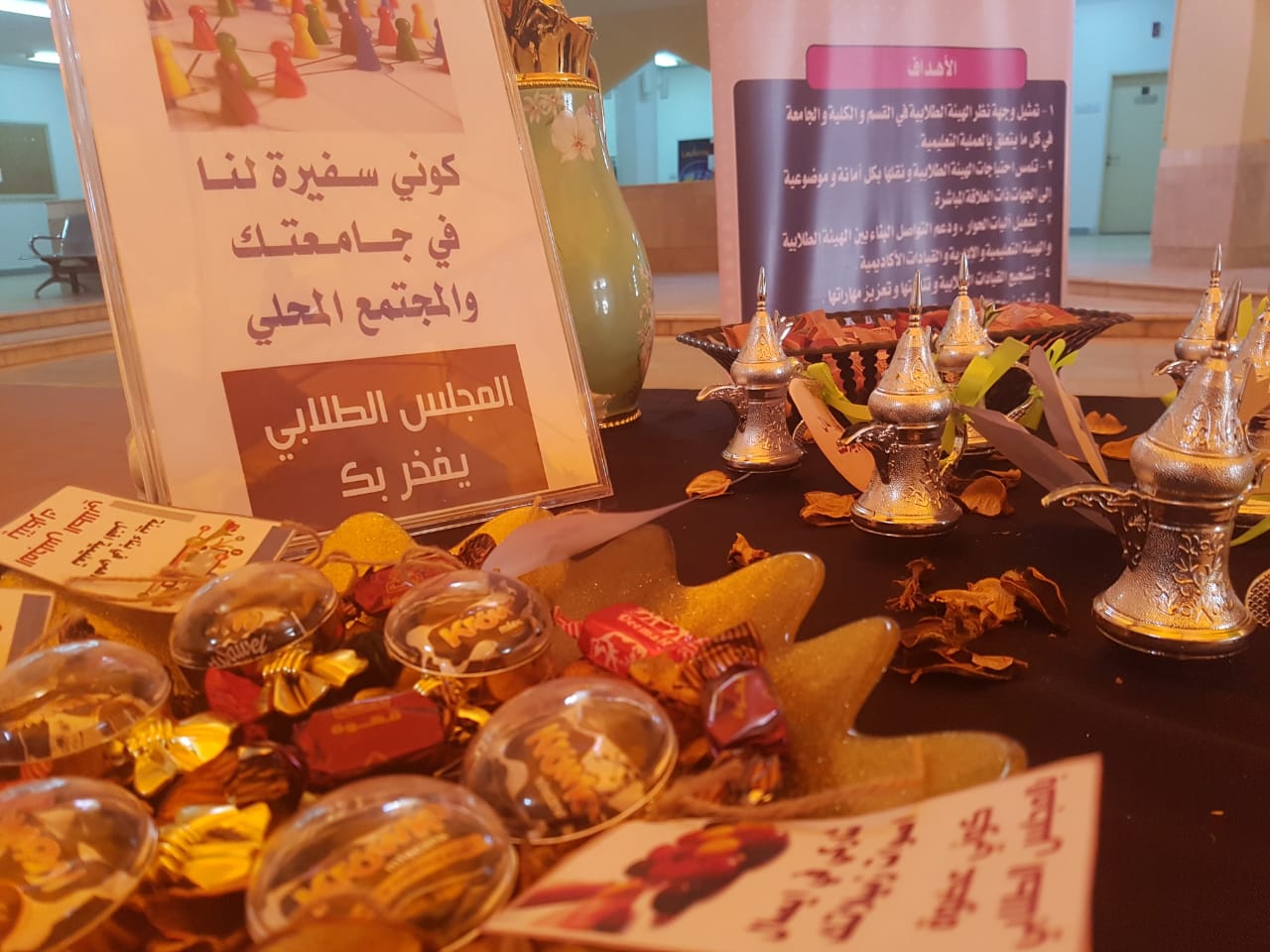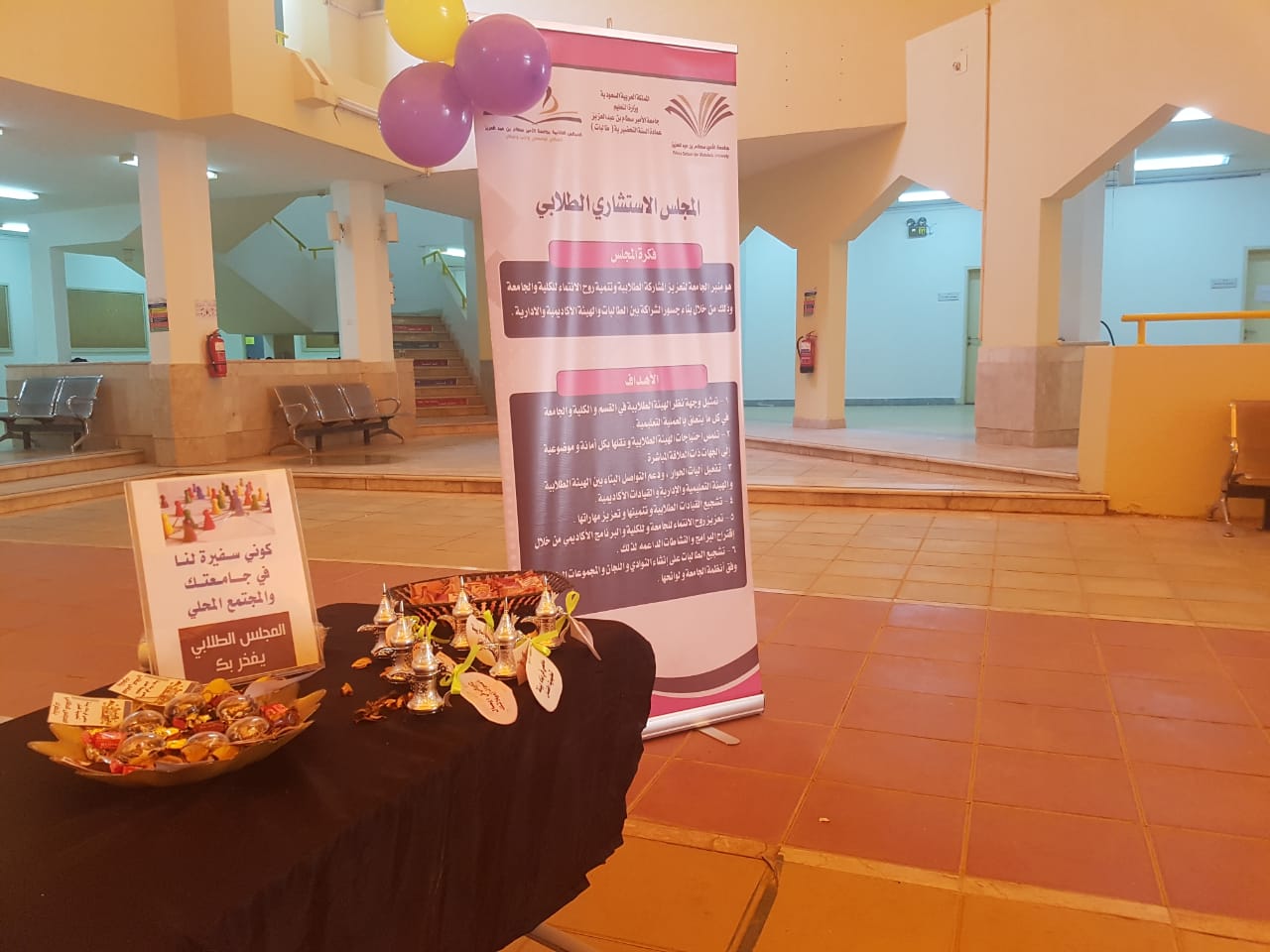 تحت إشراف وحدة العمل الطلابي ومشرفة المجلس الطلابي د/ مروة سليمان تم تنظيم لقاء تعريفي للمجلس الاستشاري الطلابي يوم الخميس الموافق 1441/2/4هـ. وتضمنت الفعالية ركن تعريفي للمجلس تم توزيع برشورات ومطويات متنوعة وعرض فيديو على الطالبات لتعريفهن برؤية ورسالة وأهداف وإجراءات و شروط الترشيح لتشكيل المجلس الطلابي ، كما تم خلال الفعالية مليء استمارة تسجيل الطالبات وتم عرض فيديو تعريفي بالمجلس على شاشات العمادة وتعميمه مع الاستمارة الالكترونية للتسجيل بالمجلس على وسيلة التواصل الاجتماعي الواتس أب لدى مجموعات الطالبات. وفي ختام اللقاء فتح المجال للطالبات لطرح استفساراتهن المختلفة كان منها : بيان أهمية التحاق الطالبات بالمجلس الطلابي، وكيفية تسجيلهن بها، وأهميته في صقل شخصيتهن ومهاراتهن، وغيرها من الأسئلة والتي تم الإجابة عليها بواسطة مشرفة المجلس الطلابي.