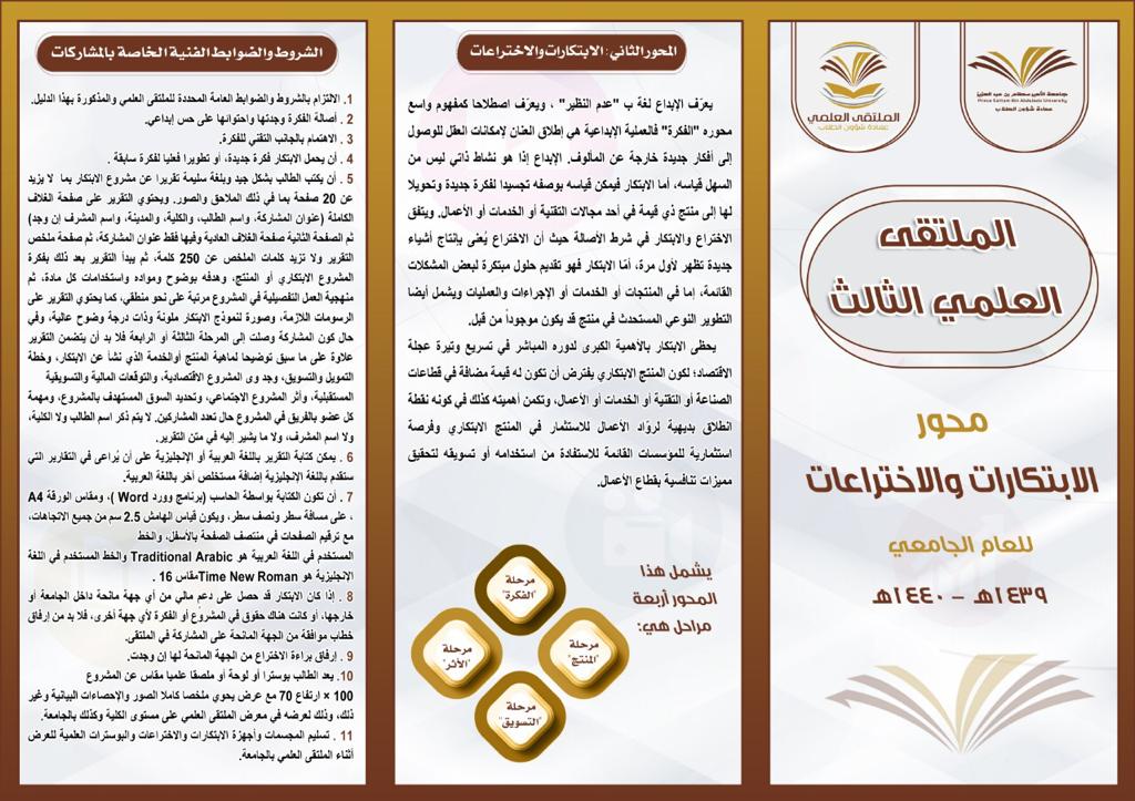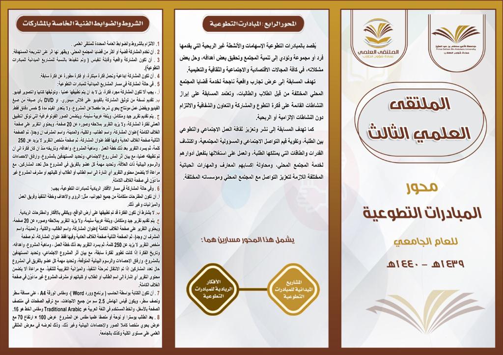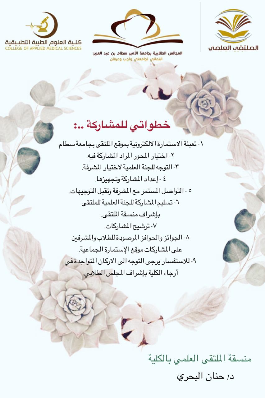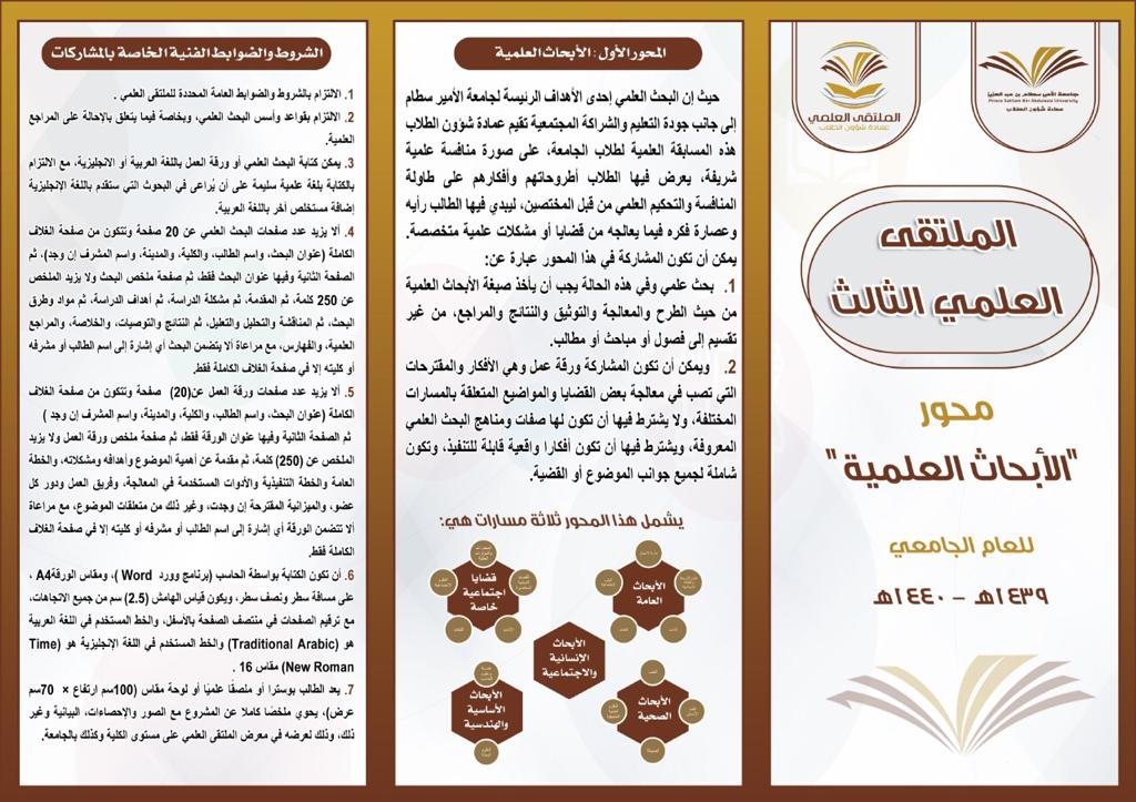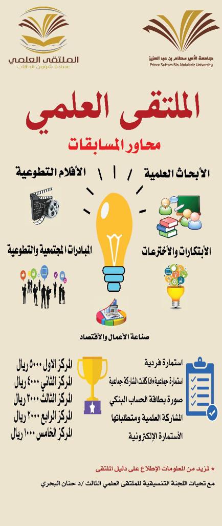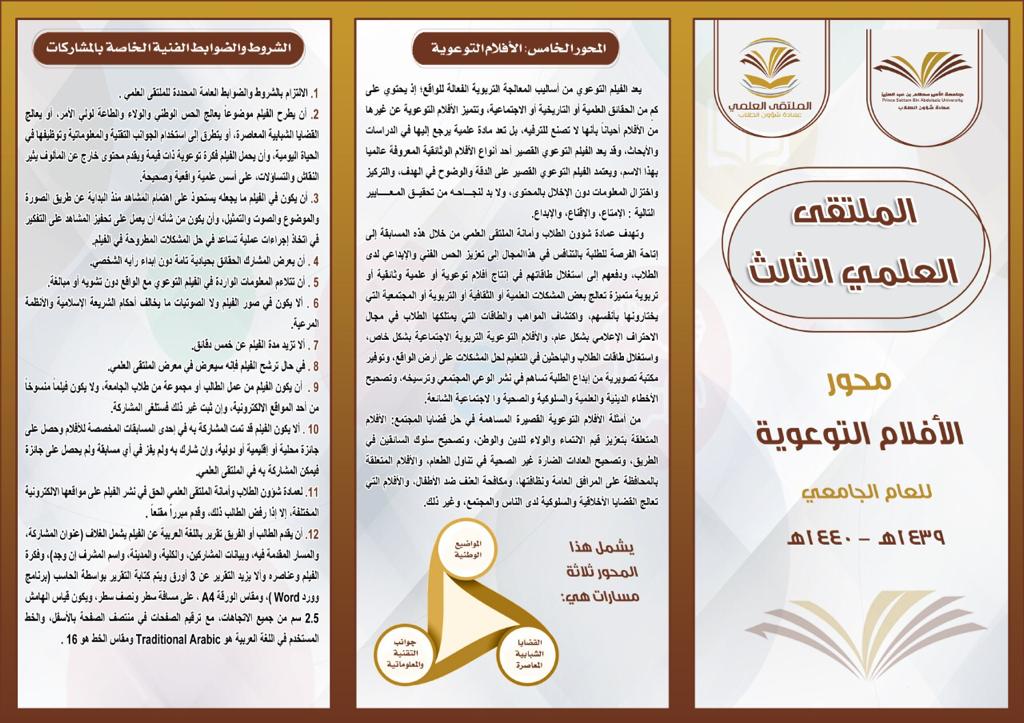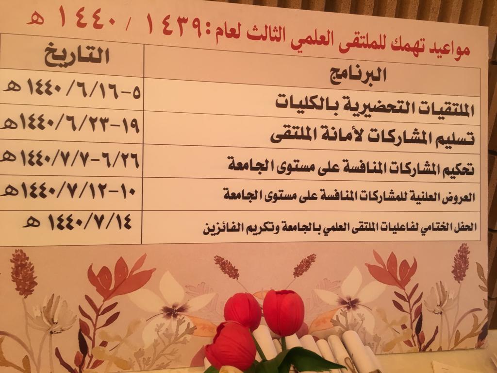 المشاركة في الملتقى العلمي الذي يهدف إلى تعزيز الملتقيات العلمية لطلاب وطالبات الجامعة منذ نسختها الأولى، تشجيعاً وتأهيلاً لهم لتحقيق التميز، وأن حرص الجامعة على إنجاح هذه الملتقيات نابع من حرصها على تهيئة جيل من الموهوبين ، والمساهمة في إكسابهم أنماط المعرفة، ودعم ابتكاراتهم وأعمالهم الإبداعية، مما يسهم بدوره في خدمة الجامعة والمجتمع متزامناً مع رؤية المملكة ٢٠٣٠ وتلتها عرض فيلم توضيحي للحضور عن الملتقى العلمي الثالث