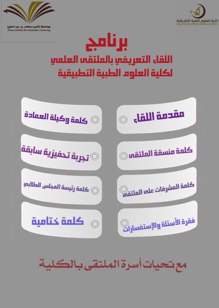 ففي يوم الثلاثاءالموافق ١٤٤٠/٤/١٩هـ أقامت كلية العلوم الطبية التطبيقية اللقاء التعريفي للملتقى العلمي الثالث وترأس هذا اللقاء وكيلة الكلية الدكتوره نوره حمد الضعيان بحضور مكثف من أعضاء هيئة التدريس والهيئة الإدارية وطالبات الكلية