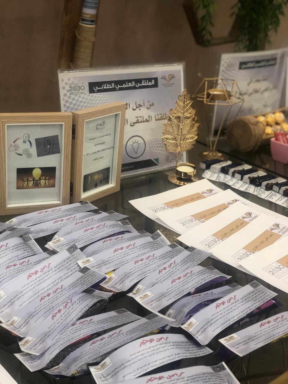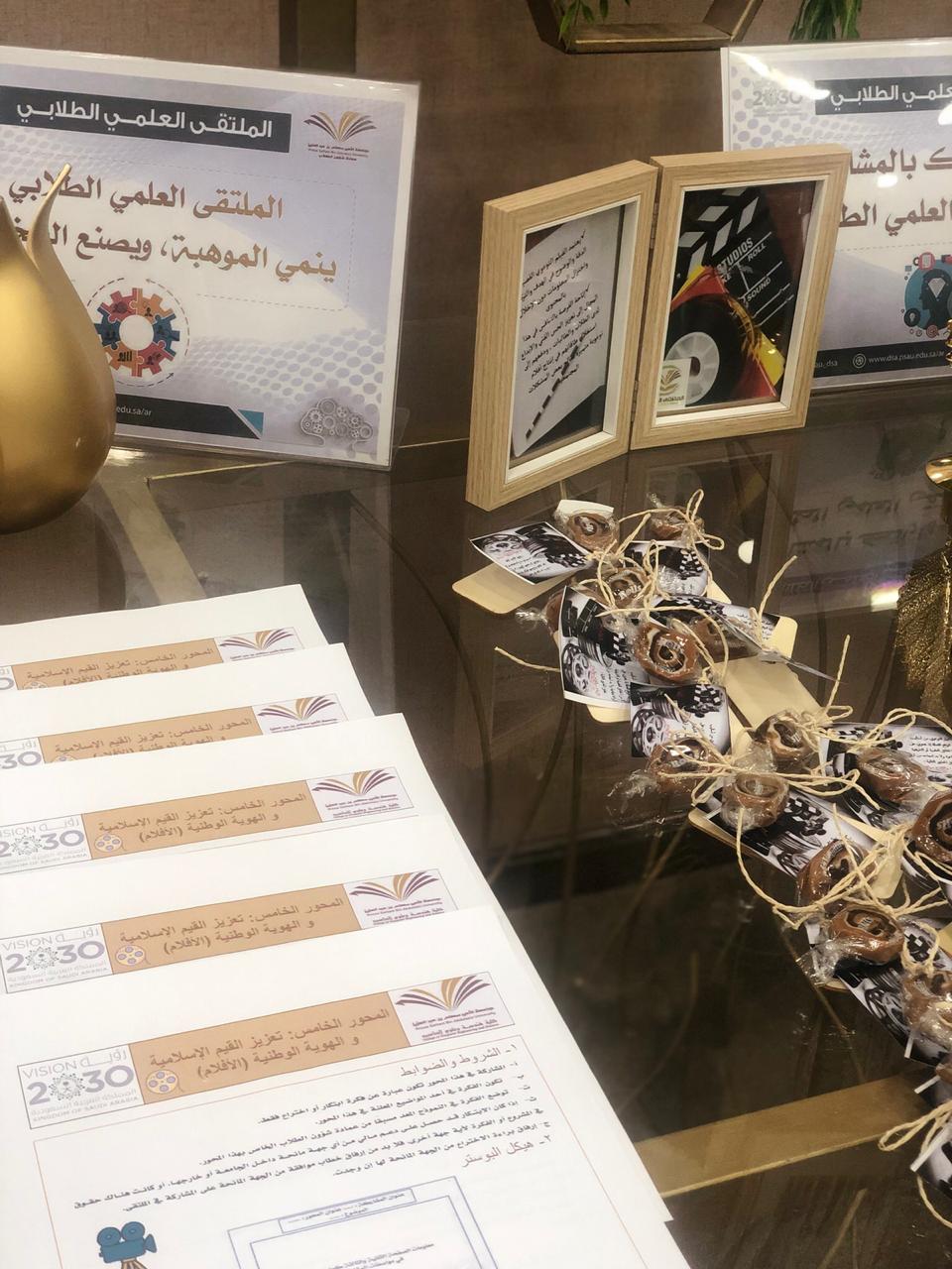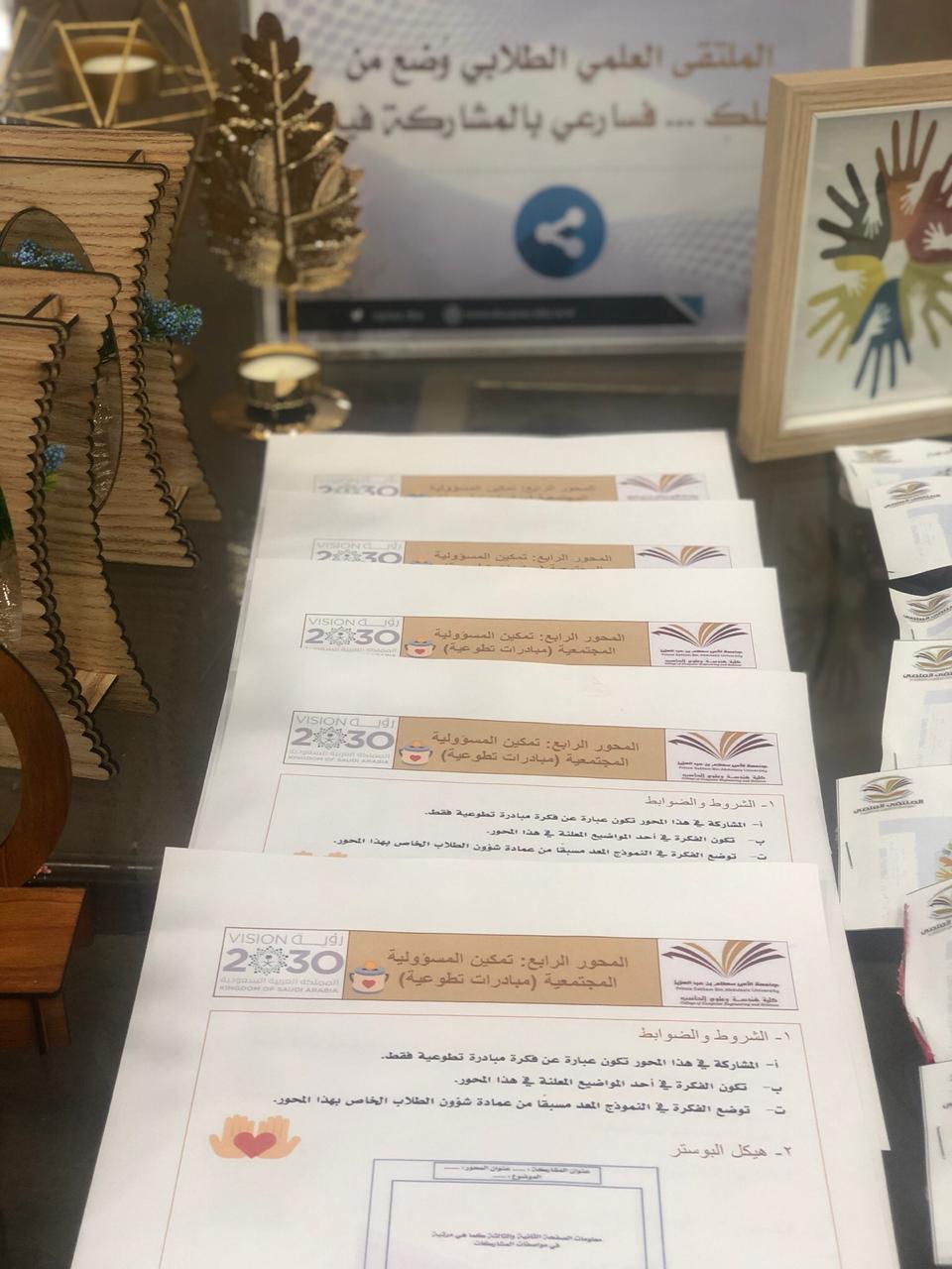 *بعد اللقاء تم وضع ركن إلى يوم الملتقى الطلابي في ساحة الكلية يحتوي على كل المنشورات الازمة لمحاور الملتقى.*