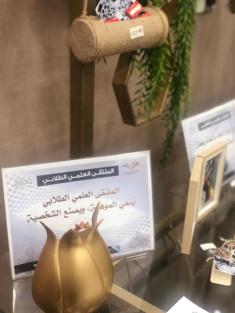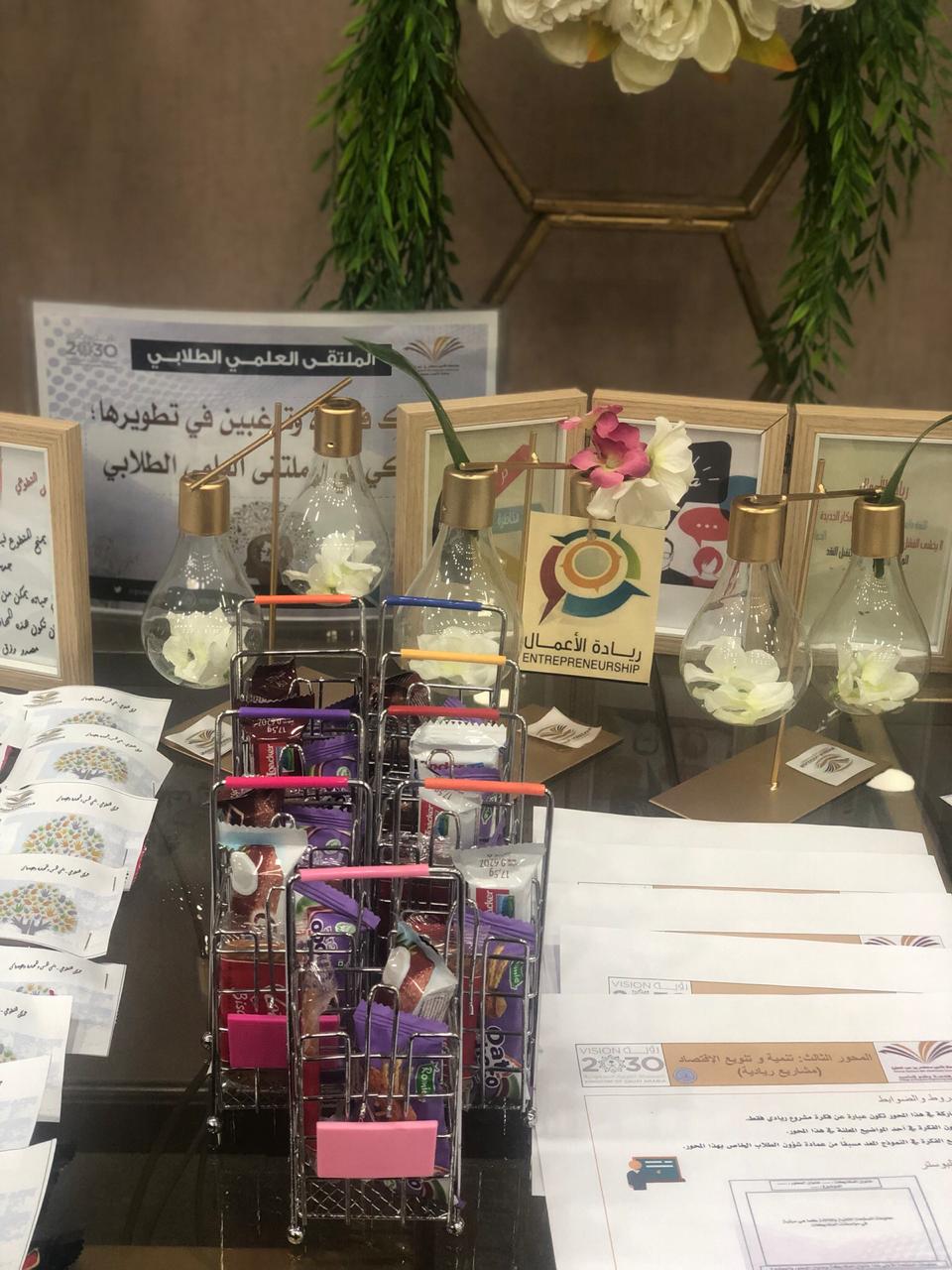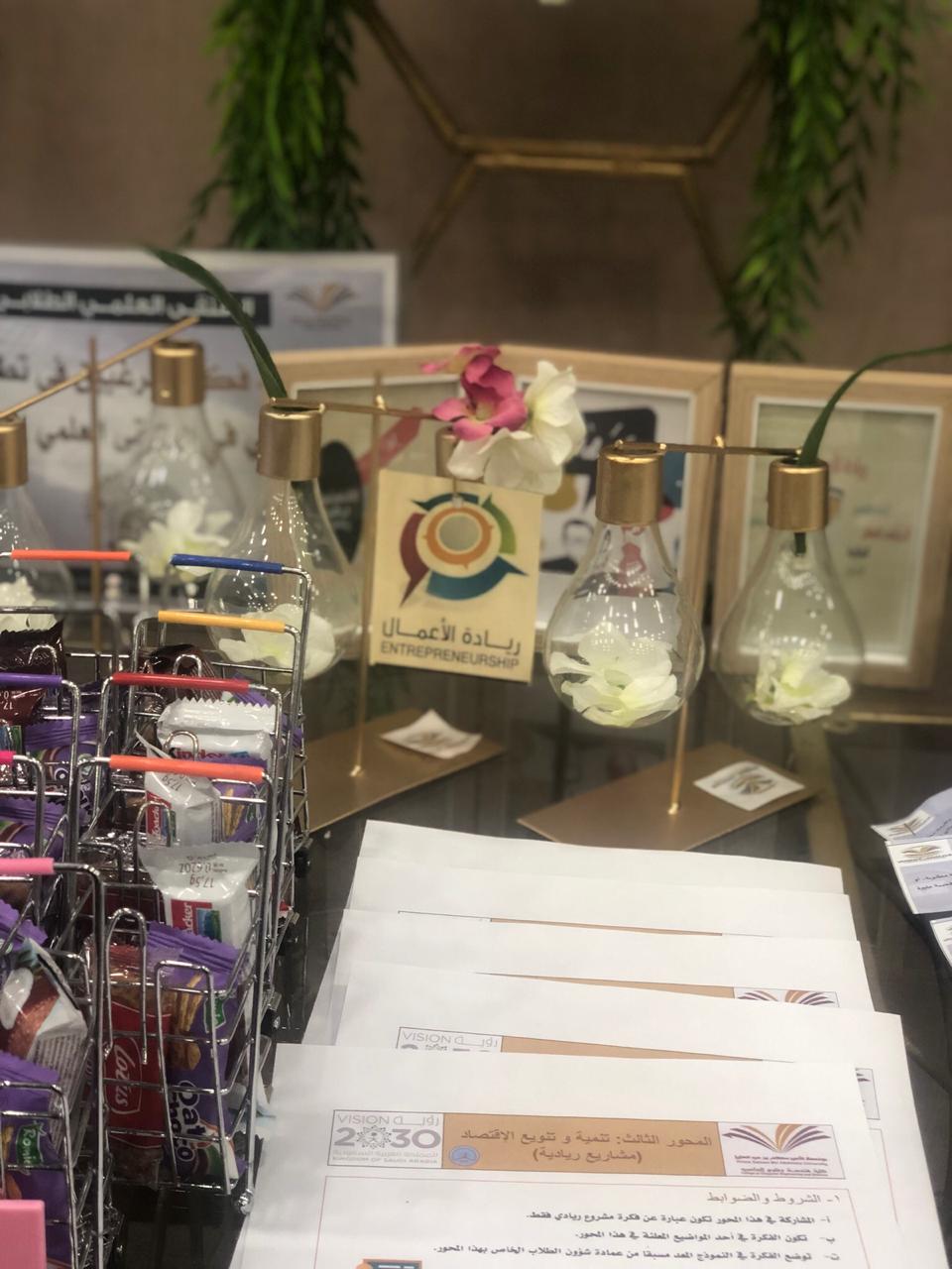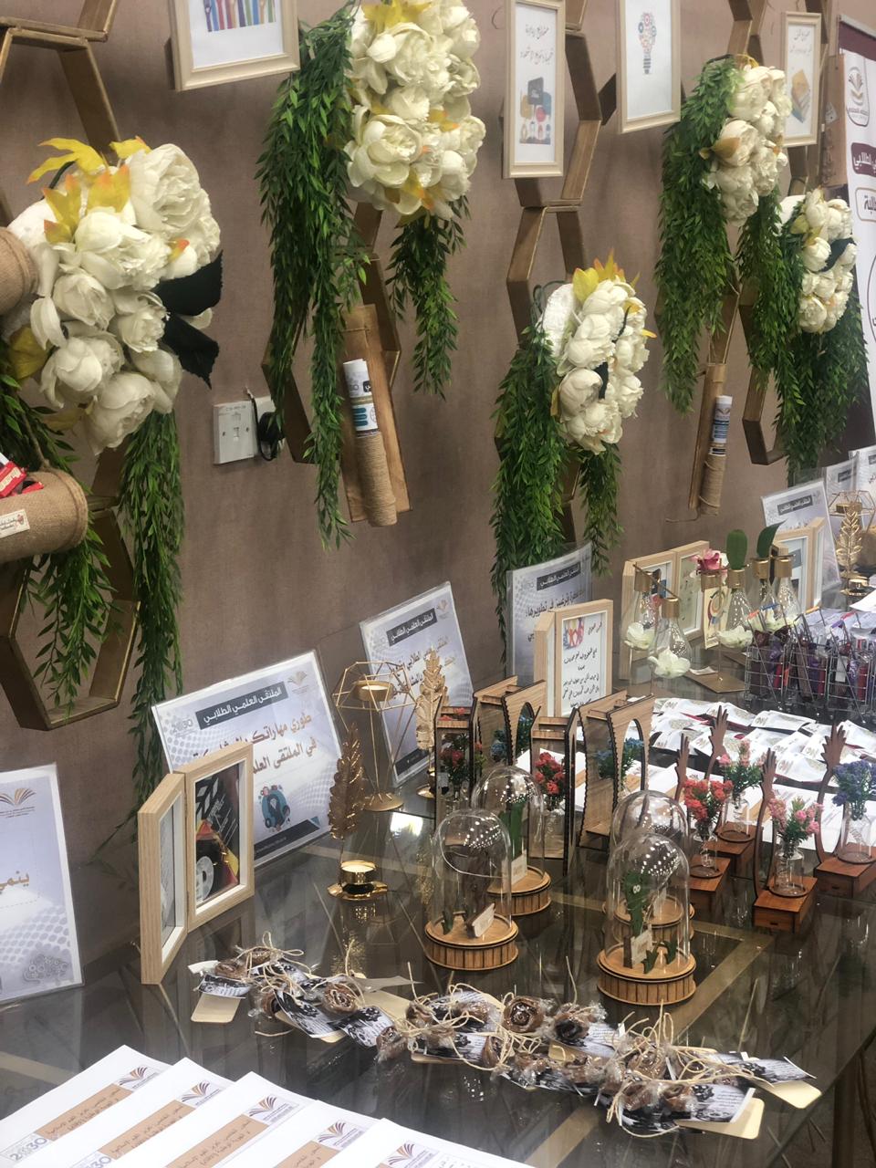والحضور من الطالبات واعضاء هيئة التدريس والطاقم الإداري بتفقد الأركان الخاصة بمحاور الملتقى العلمي الطلابي.