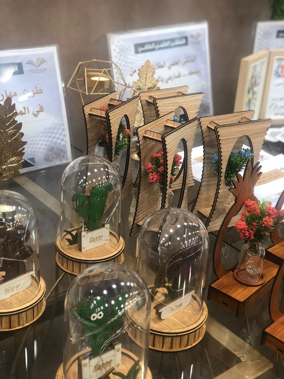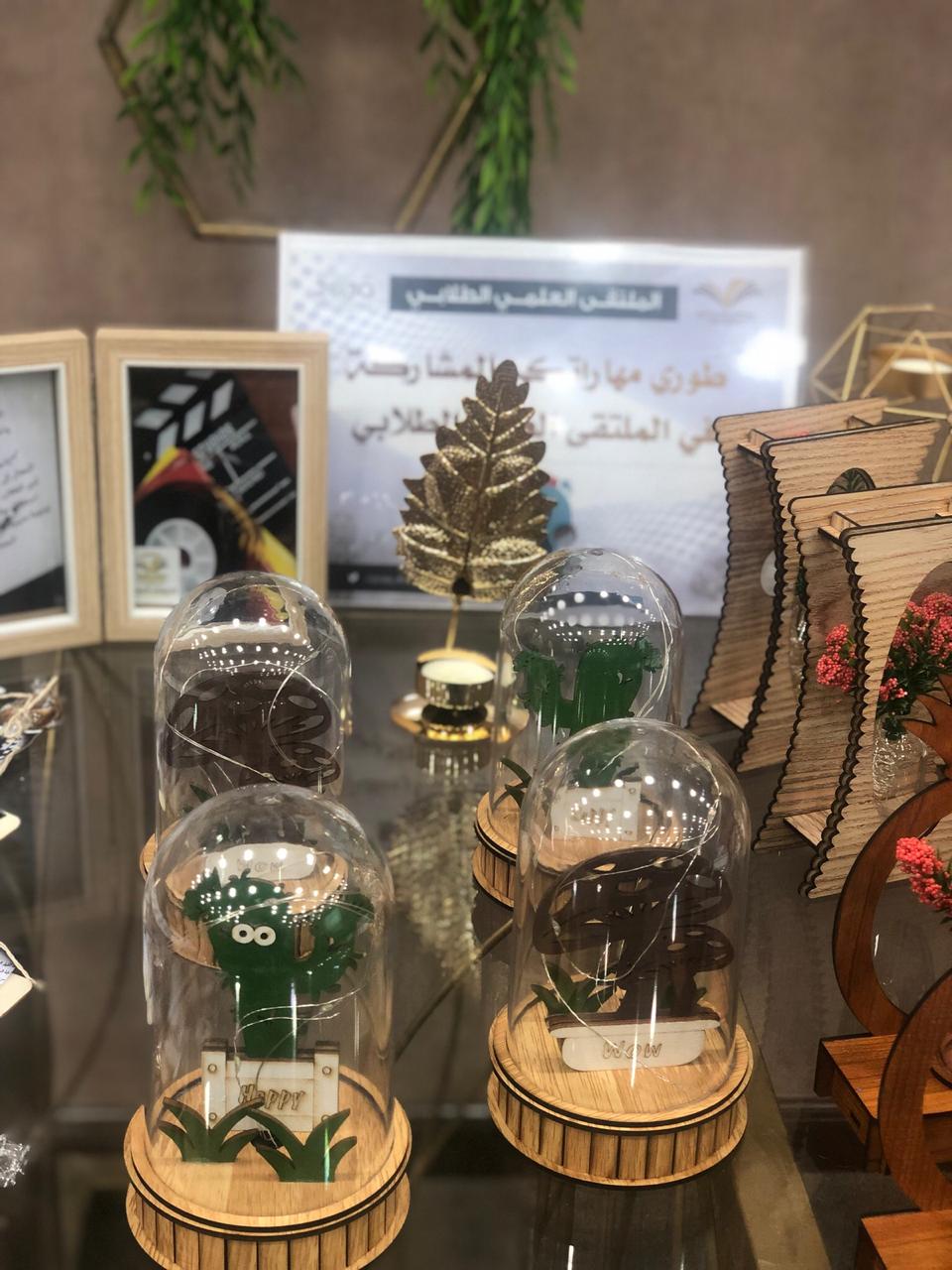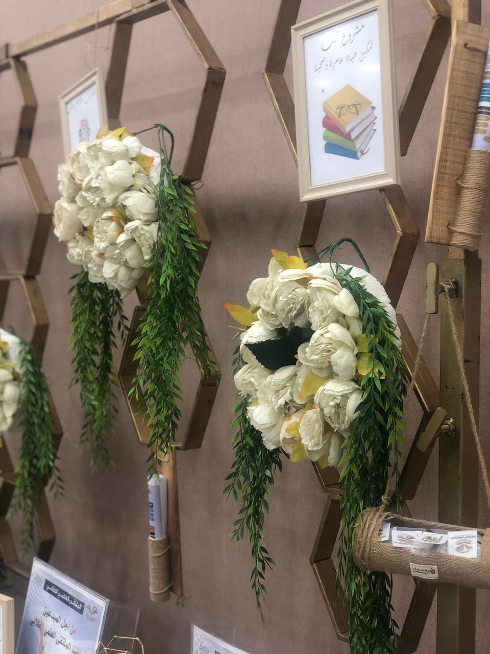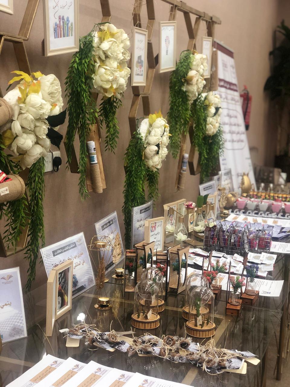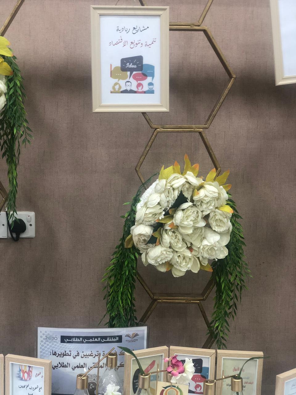 والحضور من الطالبات واعضاء هيئة التدريس والطاقم الإداري بتفقد الأركان الخاصة بمحاور الملتقى العلمي الطلابي.