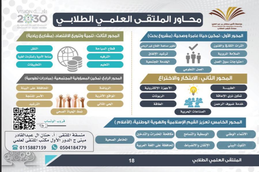 أقامت اللجنة المنسقة لأعمال الملتقى العلمى بكليه التربية بالخرج وبرعايه سعادة وكيله الكلية وتعاون وحدة العمل الطلابى اللقاء التعريفى للملتقى العلمى الطلابى اليوم الأحد الموافق 22-6-1441هـ في تمام الساعة العاشرة صباحاً حيث تم التجهيز لهذا اليوم بحملة دعائية واسعة وعلى مدار أسبوع من خلال الإعلان على الشاشات وفي بداية المحاضرات للطالبات...