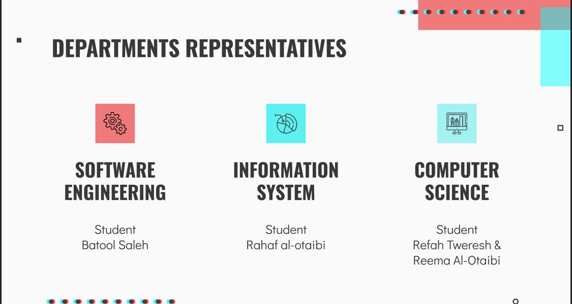 وقد شارك في هذا اللقاء مساعدة الوكيلة للشؤون الأكاديمية د.عائشة آدم و عضوة من وحدة الارشاد الاكاديمي د. راوية المكني و مشرفة مبادرة (علم وتعلم ) التابعة لوحدة الإرشاد الاكاديمي الطالبة جوزاء القحطاني , ومسؤولة وحدة العمل الطلابي أ.ريم الدميخي , ومسؤولة التعليم الالكتروني أ.امتثال النور , مسؤولة نادي الابداع أ.جابين نزير , ومسؤولة نادي البرمجة أ.شابانا زياد , وعدد من الطالبات المشاركات في أندية الكلية .