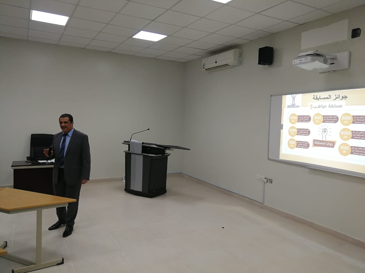 ثم قدم الدكتور / محمد حسن الأبيض مشرف الأنشطة الطلابية عرض توضيحي عن مسابقة مواهب 5 مبيناً تعريفها وأهدافها، وفروعها؛ فهي مسابقة تم إقامتها من قبل أربع مرات وهذه هي الصورة الخامسة لها، وهي تشمل تسعة محاور ولكل محور منها شروطه وجوائزه، وجاءت المحاور التسعة على الترتيب كما يلي: أفضل مقدم، ثم منشد الجامعة، ثم المشهد التمثيلي، ثم اشرحها، ثم الرسم، والتصوير، ثم أفضل تصميم، ثم أفضل مونتاج فديو، أفضل تصميم،