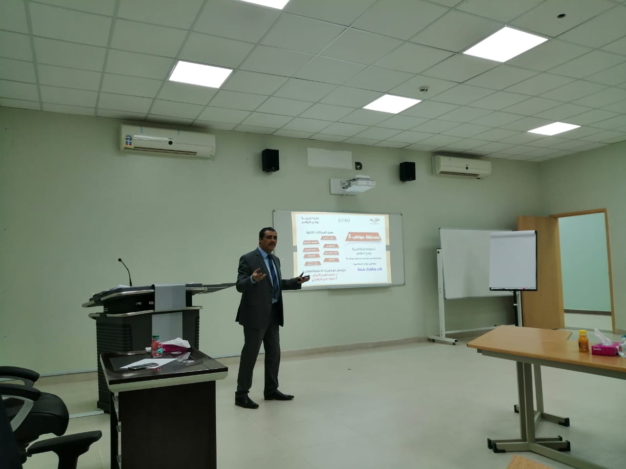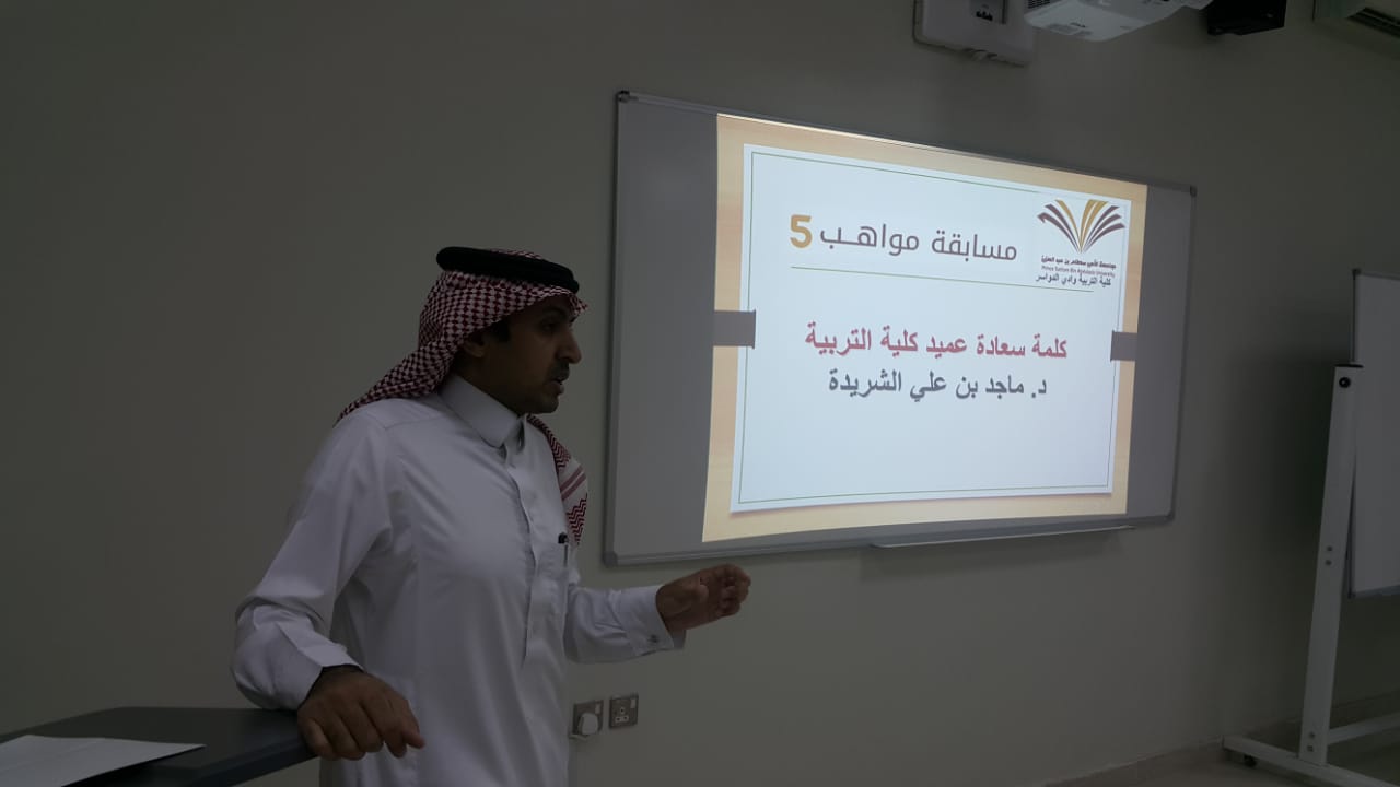 بتوجيه واشراف من عميد كلية التربية بوادي الدواسر د. ماجد بن علي الشريدة أقامت وحدة الأنشطة الطلابية بالكلية فعالية قدمها د. محمد حسن الأبيض، أستاذ الصحة النفسية المساعد بكلية التربية بالوادي – جامعة الأمير سطام بن عبد العزيز يوم الأربعاء 17/ 2 / 1441 هـ ، اللقاء التعريفي لمسابقة ومواهب" 5" بكلية التربية بوادي الدواسر.