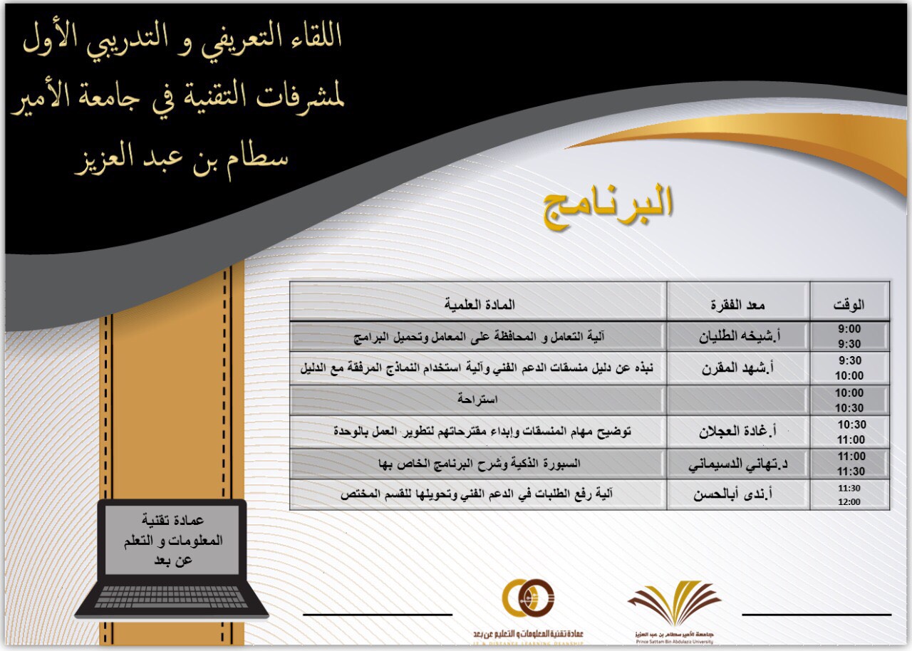 برعاية من عميد عمادة تقنية المعلومات والتعليم عن بعد د. عبدالله بن عبدالعزيز البهدل ، أقامت العمادة بشطرها النسائي في يوم الأربعاء ١٢/ ٢/ ١٤٣٩هـ الملتقى الأول لمشرفات وحدات التقنية وذلك للتعريف بالخدمات التي تقدمها العمادة لوحدات التقنية في كليات البنات وآلية رفع طلبات الدعم الفني وتحويلها للقسم المختص وقد تم ايضاً إطلاع المشاركات على آلية التعامل والمحافظة على المعامل وتحميل البرامج، وتم تقديم دليل منسقات وحدات التقنية وتوضيح لمهام المشرفات وتقديم الأدلة الخاصة ببعض الأجهزة كالسبورة الذكية وكيفية التعامل معها وأدلة للمستخدم. وفي نهاية اللقاء تم عقد جلسة لتبادل الخبرات بين مشرفات وحدات التقنية ومنسوبات العمادة لبحث أفضل استراتيجيات تنفيذ العمل ومناقشة بعض التحديات وتلقي بعض المقترحات التطويرية .
