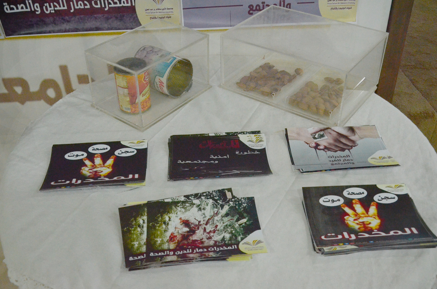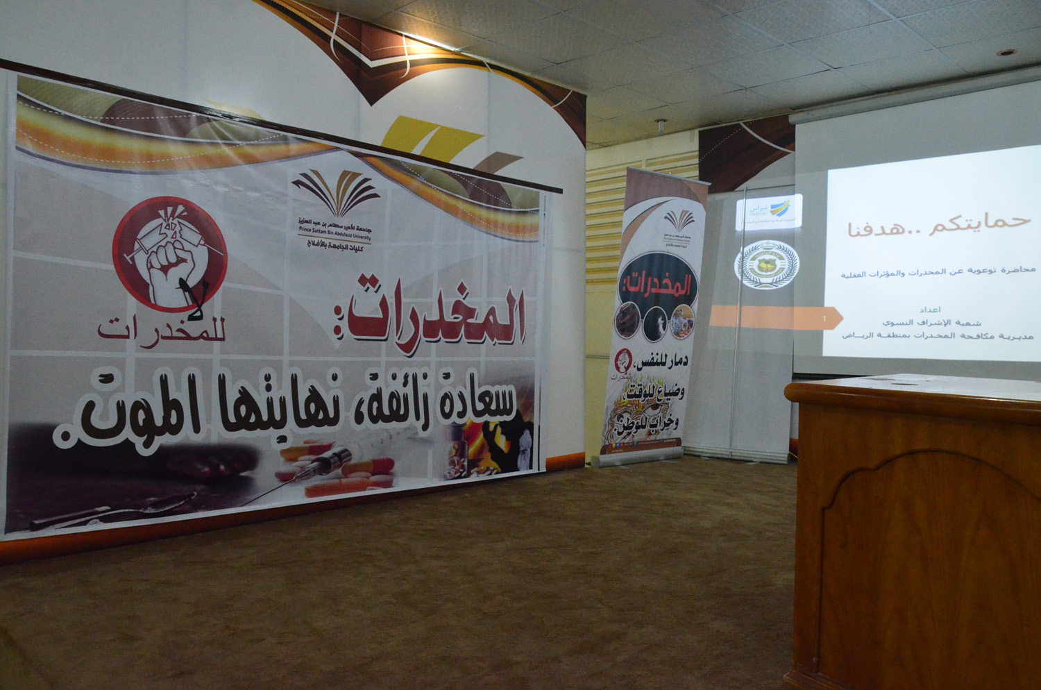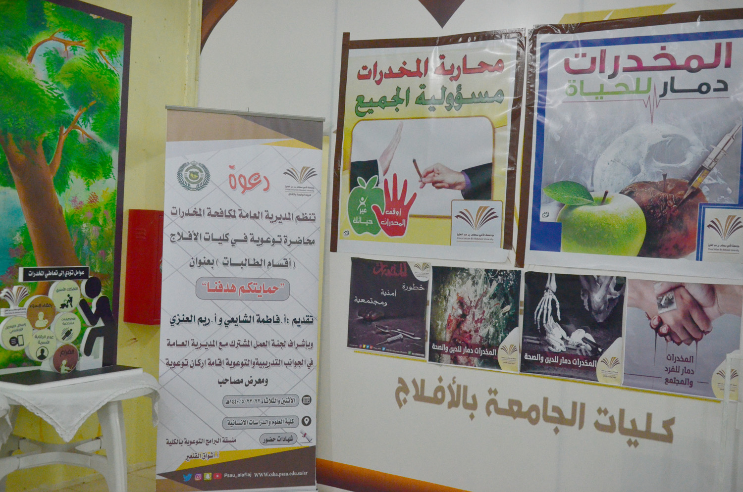 نظمت كلية العلوم والدراسات الإنسانية بالأفلاج ( شطر الطالبات ) يومي الأثنين و الثلاثاء 1440/5/22 هـ الساعة العاشرة والنصف في قسمي الكلية الأدبي والعلمي تحت اشراف لجنة العمل المشترك مع المديرية العامة لمكافحة المخدرات محاضرة توعوية بعنوان ( حمايتكم هدفنا ) قدمتها أ/فاطمة الشايعي و أ/ ريم العنزي صاحبها معرض بأنواع المخدرات وطرق تهريبها وكذلك منشورات توعوية ، استهلت المحاضرة بعرض أنواع المخدرات و تأثيرها و طريقة صناعتها و مكوناتها و الأعراض التي تظهر على مستخدميها ، كما عرضت بعض الأدوية الطبية المصرح بها التي قد تؤدي إلى الإدمان في حال الإستخدام الخاطئ لها ، وكذلك المستنشقات الطيارة ، و أنواع جديدة للمخدرات صممت خصيصاً لإستهداف صغار السن ، تطرقت بعدها لكيفية الحصانة و الحماية منها ، تلاها عرض طرق التواصل مع المديرية للبلاغات و سرية التعامل معها .