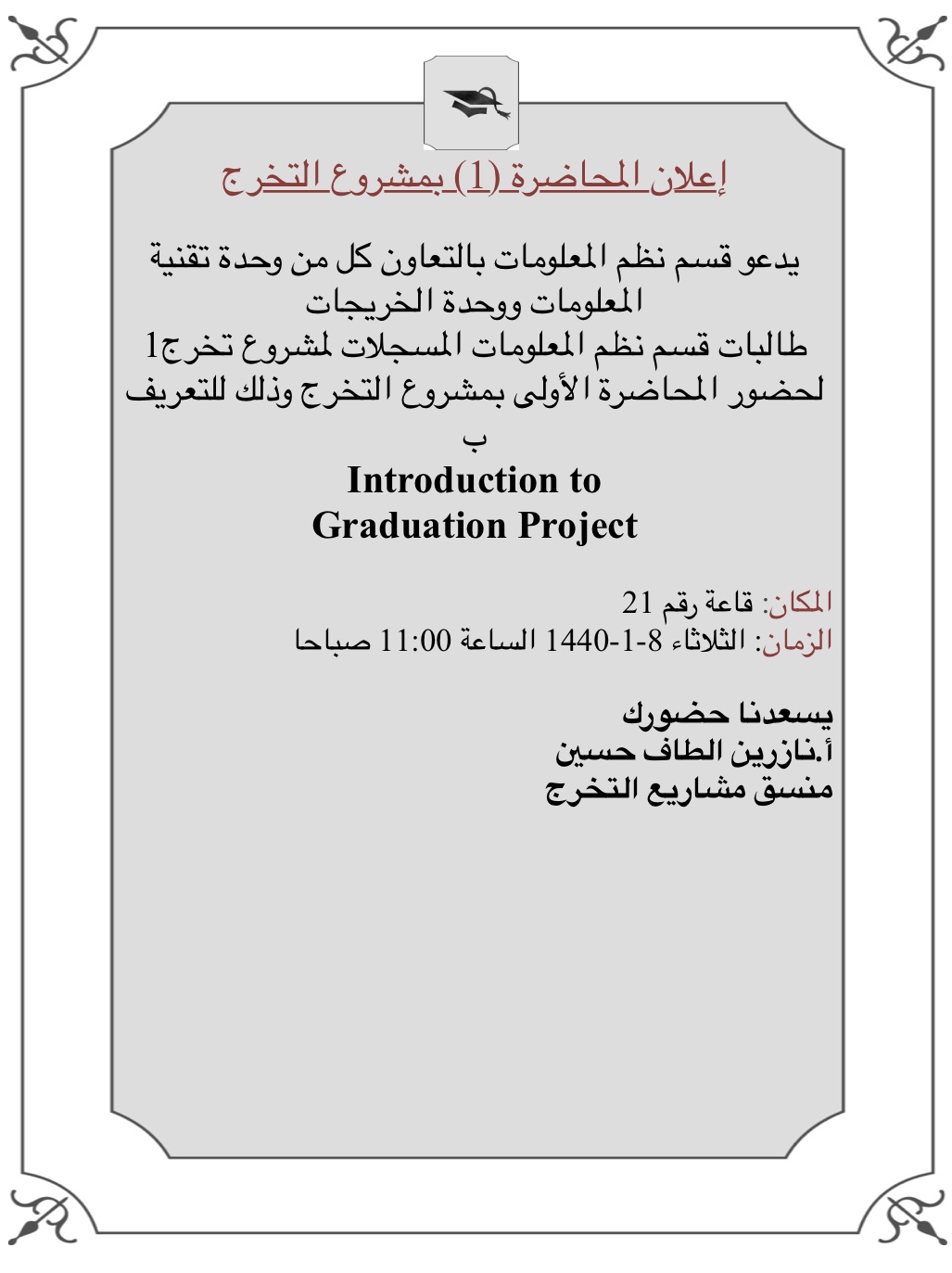 Introduction to Graduation Project. ، استهدفت المحاضرة طالبات قسم نظم المعلومات المسجلات لمشروع تخرج وعقدت في قاعة رقم 28 يوم الثلاثاء 8/ 1/ 1440 هـ الساعة :11 صباحاً. تم تنسيق وإلقاء هذه المحاضرة من قبل أ.نازرين الطاف حسين منسقة مشاريع التخرج وبإشراف ومتابعة رئيسة قسم نظم المعلومات بالكلية الدكتورة هبة الله الويشي من أجل تحقيق الأهداف المنشودة منها. تهدف هذه المحاضرة إلى تهيئة الطالبات المسجلات في مقرر مشروع التخرج للعمل على اتمامه ورفع مستوى الفهم والاستيعاب لديهم. وقد لاقت هذه المحاضرة حضور عدد كبير من الطالبات.