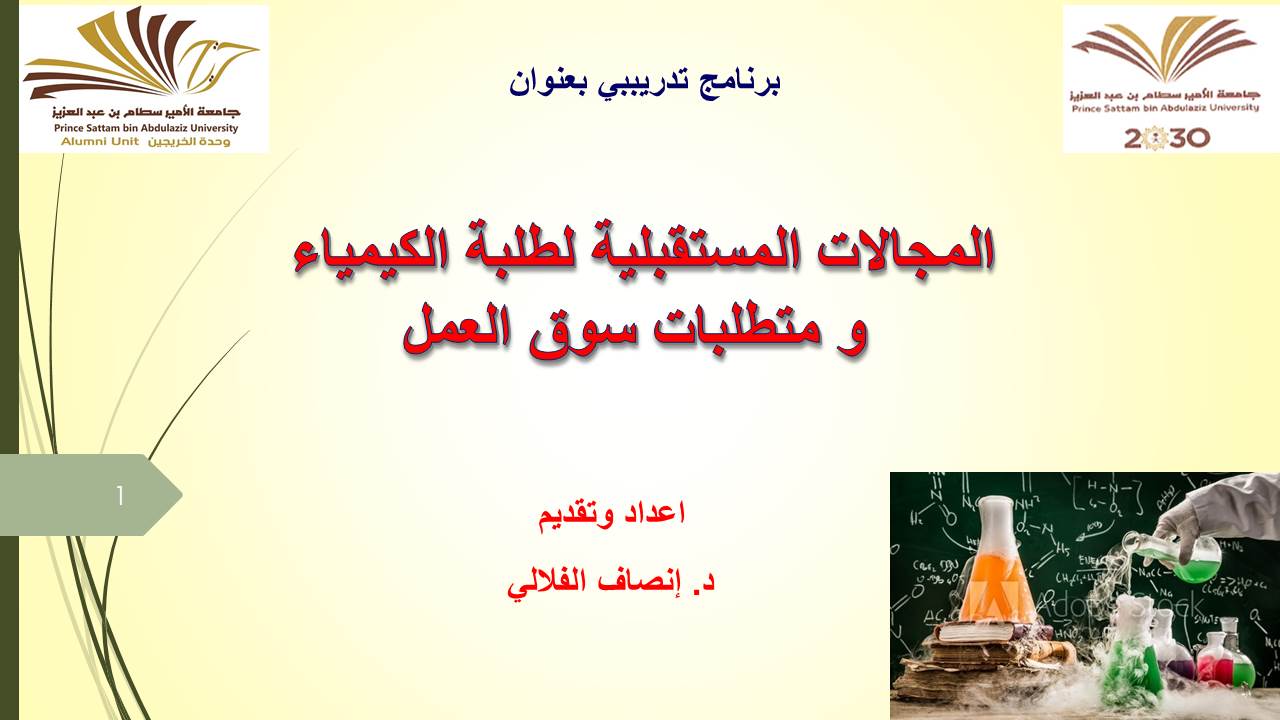 قامت وحدة الخريجات بكلية العلوم والدراسات الإنسانية بالخرج ممثلة في لجنة تنمية المهارات المهنية ضمن برامج الدورات التخصصية بتنظيم دورة تدريبية عن بعد تحت عنوان (المجالات المستقبلية لطلبة الكيمياء ومتطلبات سوق العمل) وذلك يوم الاربعاء الموافق 23/7/1442هـ في تمام الساعة 7 مساءًا وكانت من تقديم الدكتور انصاف الفلالي من قسم الكيمياء.