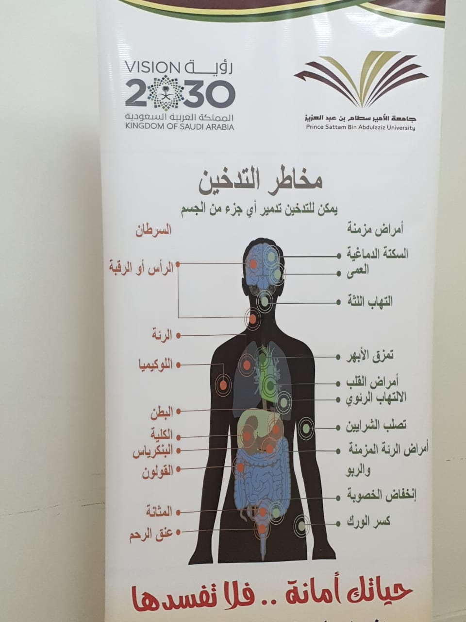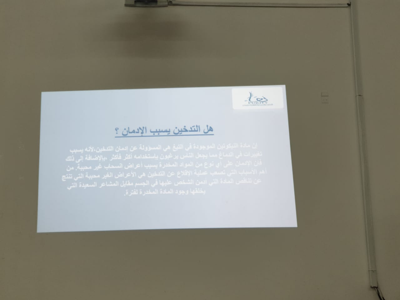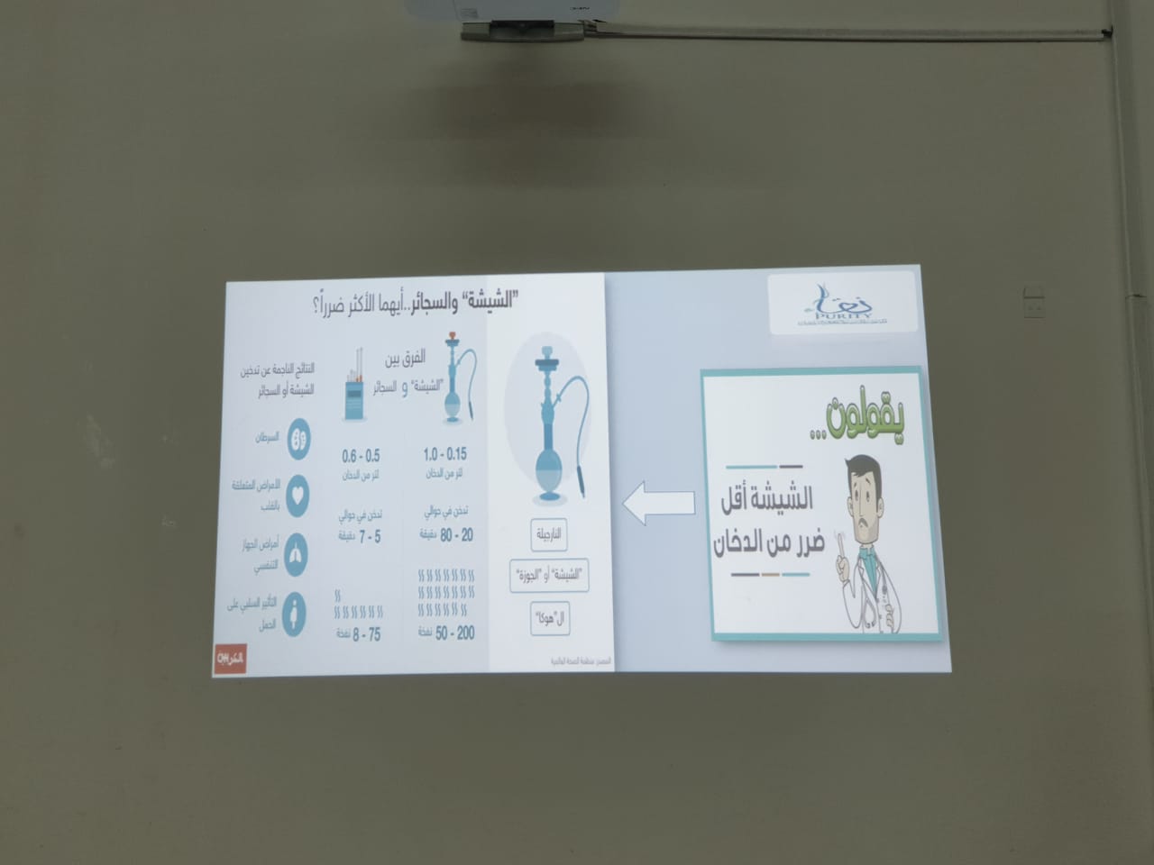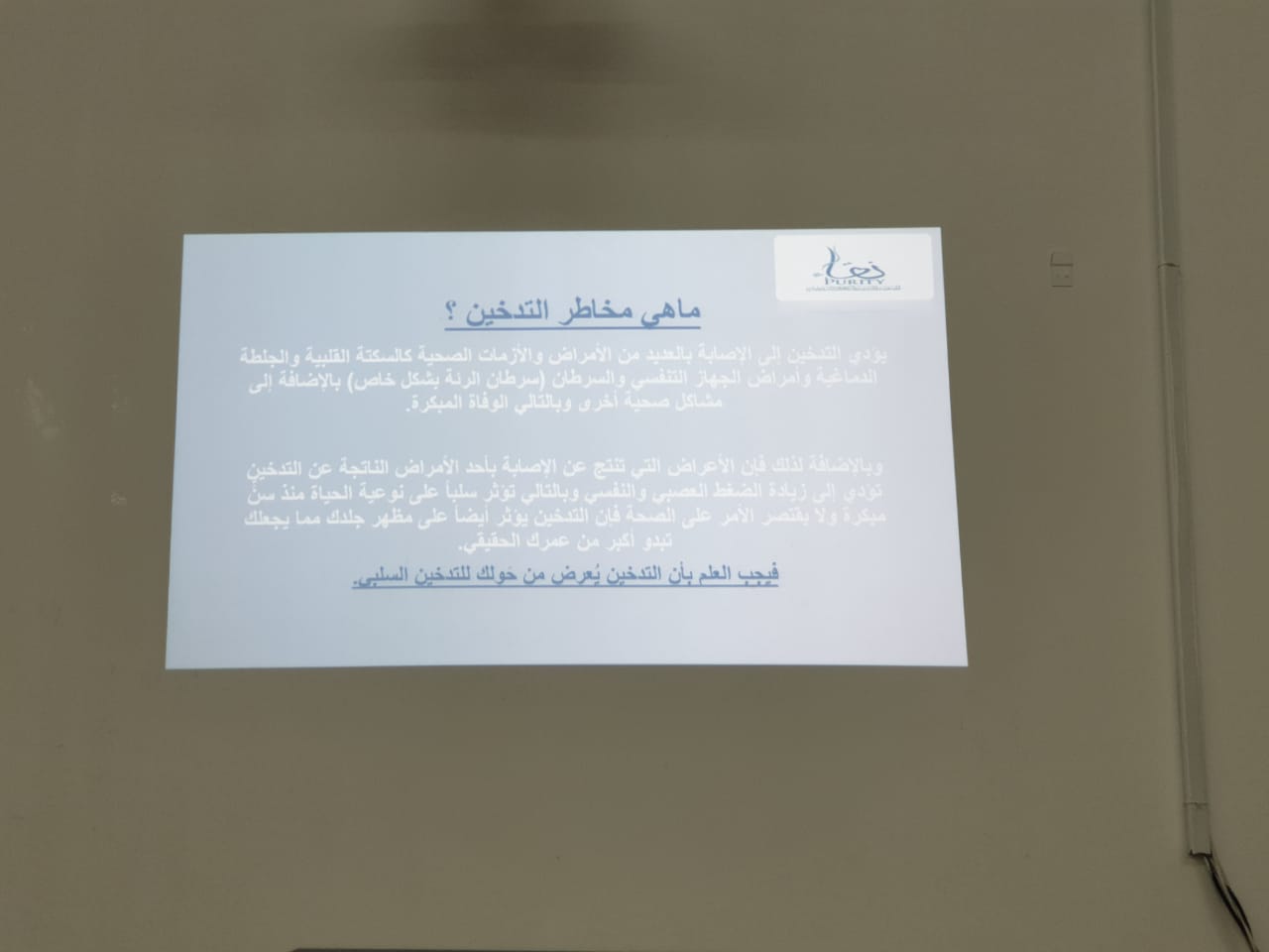لما للتدخين من أضرار على الشخص والمجتمع ولزيادة الوعي والتثقيف بمضارهم نظم المجلس الطلابي بعمادة السنة التحضيرية قسم الطالبات وبمشاركة " جمعية نقاء" فعالية توعوية بعنوان : " أطفئيها أنت ثمينة (لا للتدخين)" وذلك يوم الأربعاء الموافق 1441/6/18هـ. حيث تضمنت الفعالية محاضرة وعرض تقديمي من تقديم أ. أشواق الأحمدي مسؤلة التوعيه و أ. بشاير بن مبروك أخصائية نفسية عن أضرار التدخين وكيفية معالجته والقضاء عليه وأسباب الوقوع في التدخين وكما تمت ايضاً مناقشة التدخين السلبي وتأثير المدخن على من حوله ، وقد تم توزيع برشورات ومطويات من إعداد الطالبات على منسوبات وطالبات العمادة وكما لاقت الفاعلية تفاعل الحضور واستحسانهم واعجابهم بها .