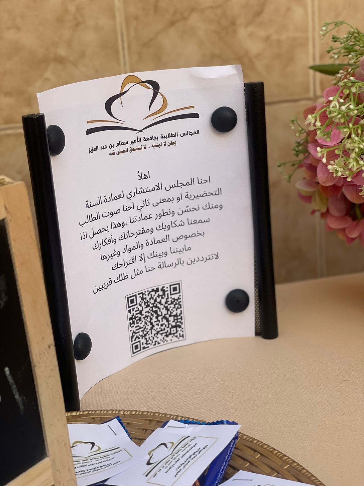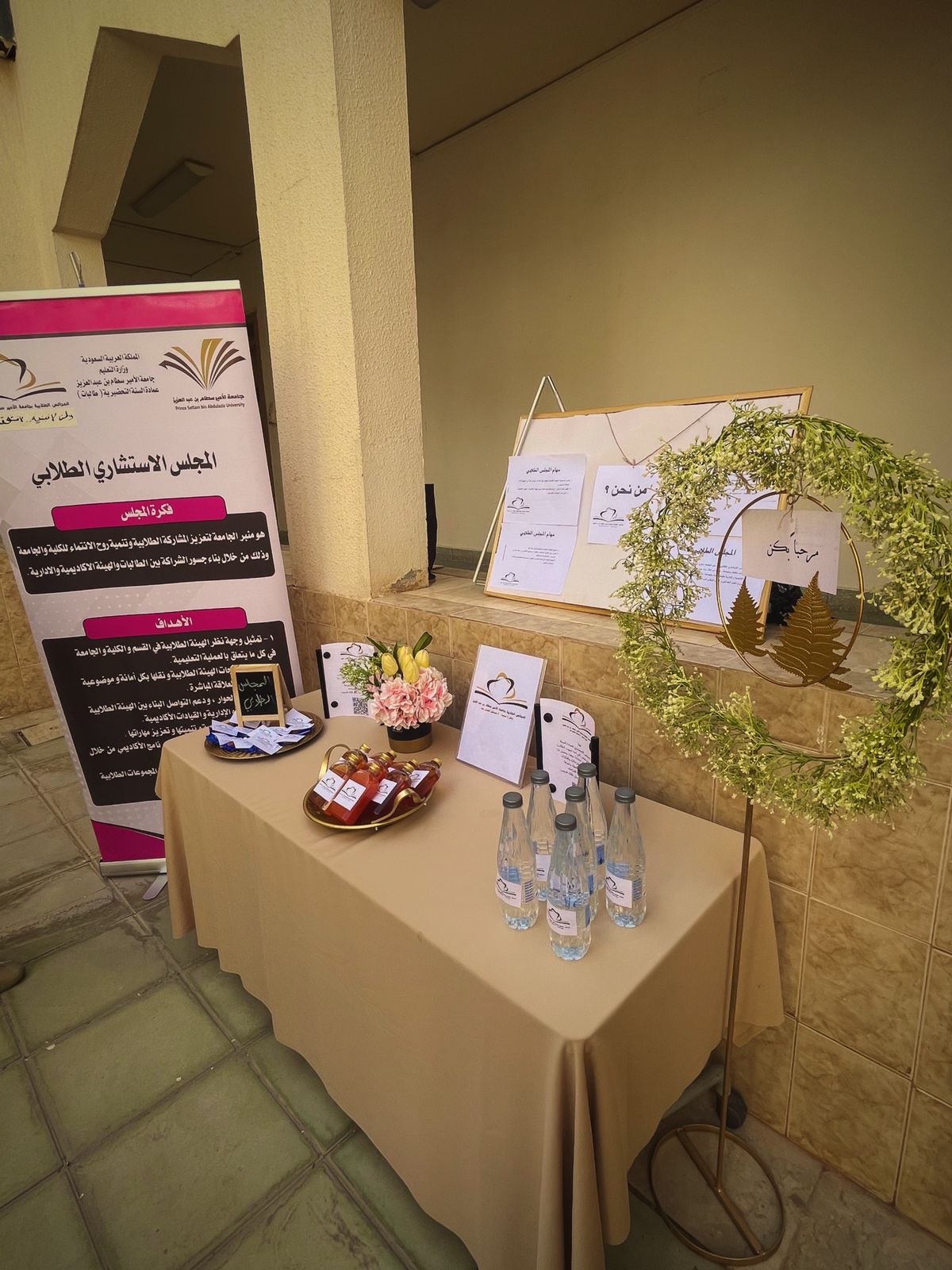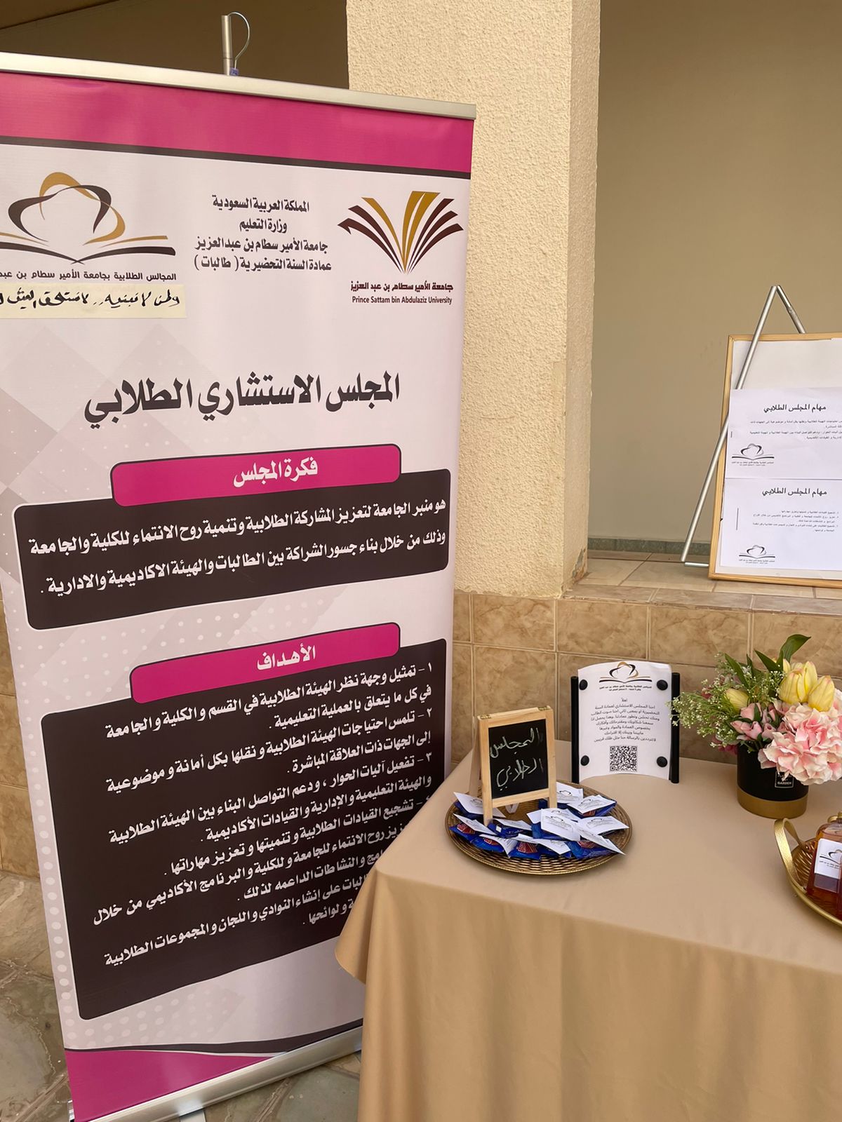 ابتدأ المجلس الطلابي بعمادة السنة التحضيرية_ قسم الطالبات أول أنشطته وذلك يوم الاربعاء الموافق 1443/3/14هـ في بهو العمادة، بحضور منسوبات وطالبات العمادة. حيث تم عمل ركن لتعزيزالمشاركة الايجابية الطلابية وتنمية روح الولاء للجامعة بعنوان "وطن لا نبنيه لا نستحق العيش فيه" وركزت رئيسة المجلس الطالبة رهام القحطاني بالتعريف بالمجلس الطلابي ومهامه وأهدافه والتي من أهمها تلمس مشكلات الطالبات واحتياجاتهن ومن ثم مناقشتها مع الجهات ذات العلاقة ، وتوضيح آلية التواصل مع المجلس الطلابي وذلك بتعبئة النموذج الالكتروني الخاص لمناقشة أي قضية طلابية أو اقتراح، كما تضمن الركن مجموعة من النصائح لطالبات العمادة للتغلب على التوتر خلال الاختبارات ، من خلال التحضير والالتزام بجدول منظم للمراجعة والحصول على فترات راحة بانتظام لإعادة تنشيط الذهن وغيرها من النصائح.