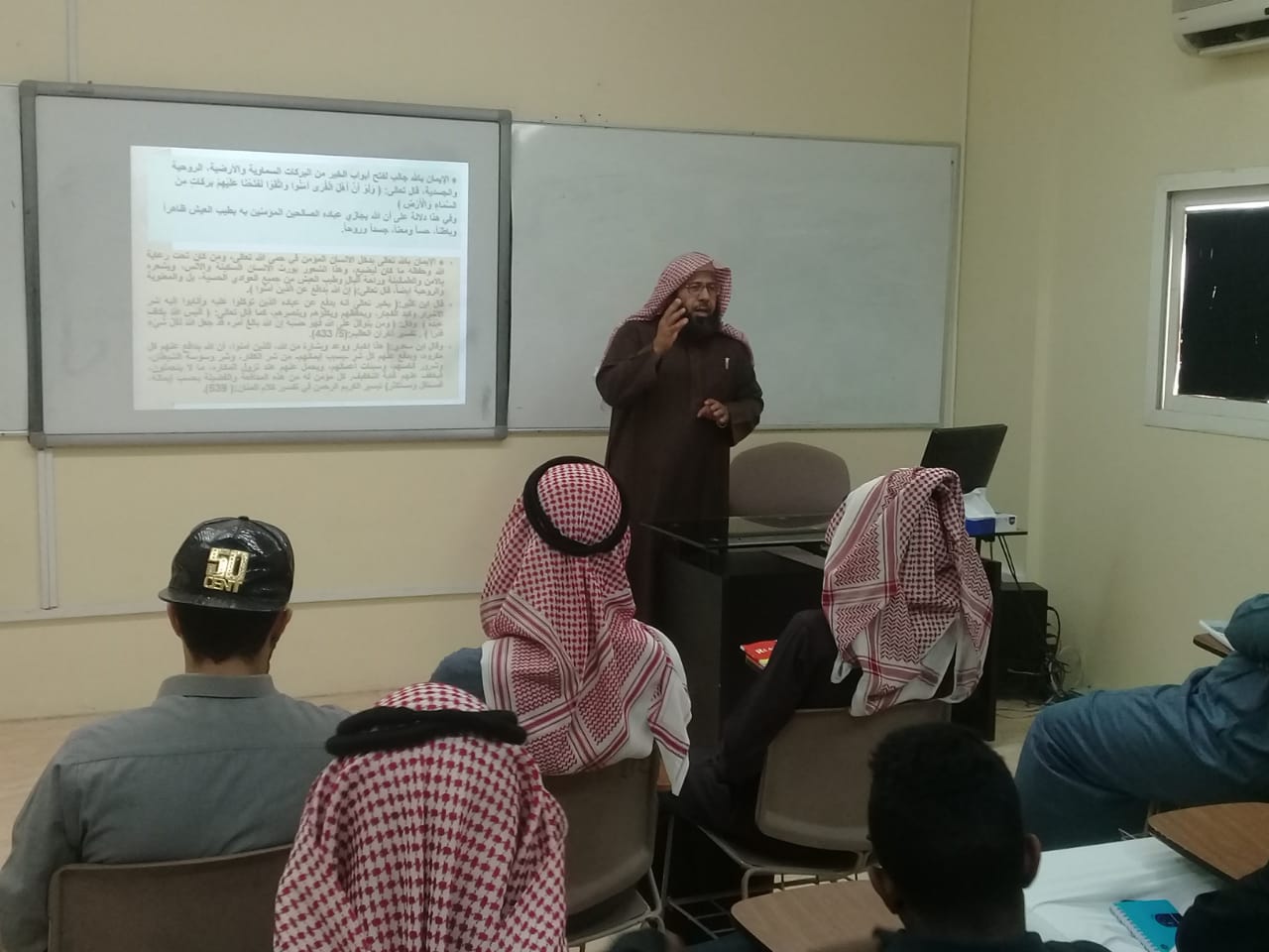 في إطار اهتمام كلية المجتمع بالخرج بنشر الوعي الفكري وتعزيز الاستقرار النفسي للطلاب أقامت وحدة الوعي الفكري لقاءًا تربويًا بعنوان" أركان الإيمان وأثرها في تحقيق الأمن النفسي " قدمها سعادة الدكتور/ عبدالله بن حسن الحبجر الأستاذ المساعد بكلية التربية بالحوطة، وذلك يوم الثلاثاء الموافق 30/5/1440هـ وقد تناول اللقاء أثر أركان الإيمان في إدخال الأمن والراحة في نفس الإنسان. كما تخلل هذا اللقاء العديد من الأمثلة والأدلة على دور الإيمان في تحقيق الأمن النفسي للفرد المسلم. وبعد ذلك قدم سعادة الدكتور/ عبدالله الحبجر بعض النصائح والتوجيهات واستمع إلى أسئلة واستفسارات الطلاب. كما تقدم بخالص الشكر إلى سعادة الدكتور/ حمد بن عبدالله القميزي على إقامة مثل هذه اللقاءات التي تستهدف نشر ثقافة الأمن الفكري وحماية عقول الطلاب من الأفكار الضالة والتيارات المنحرفة.