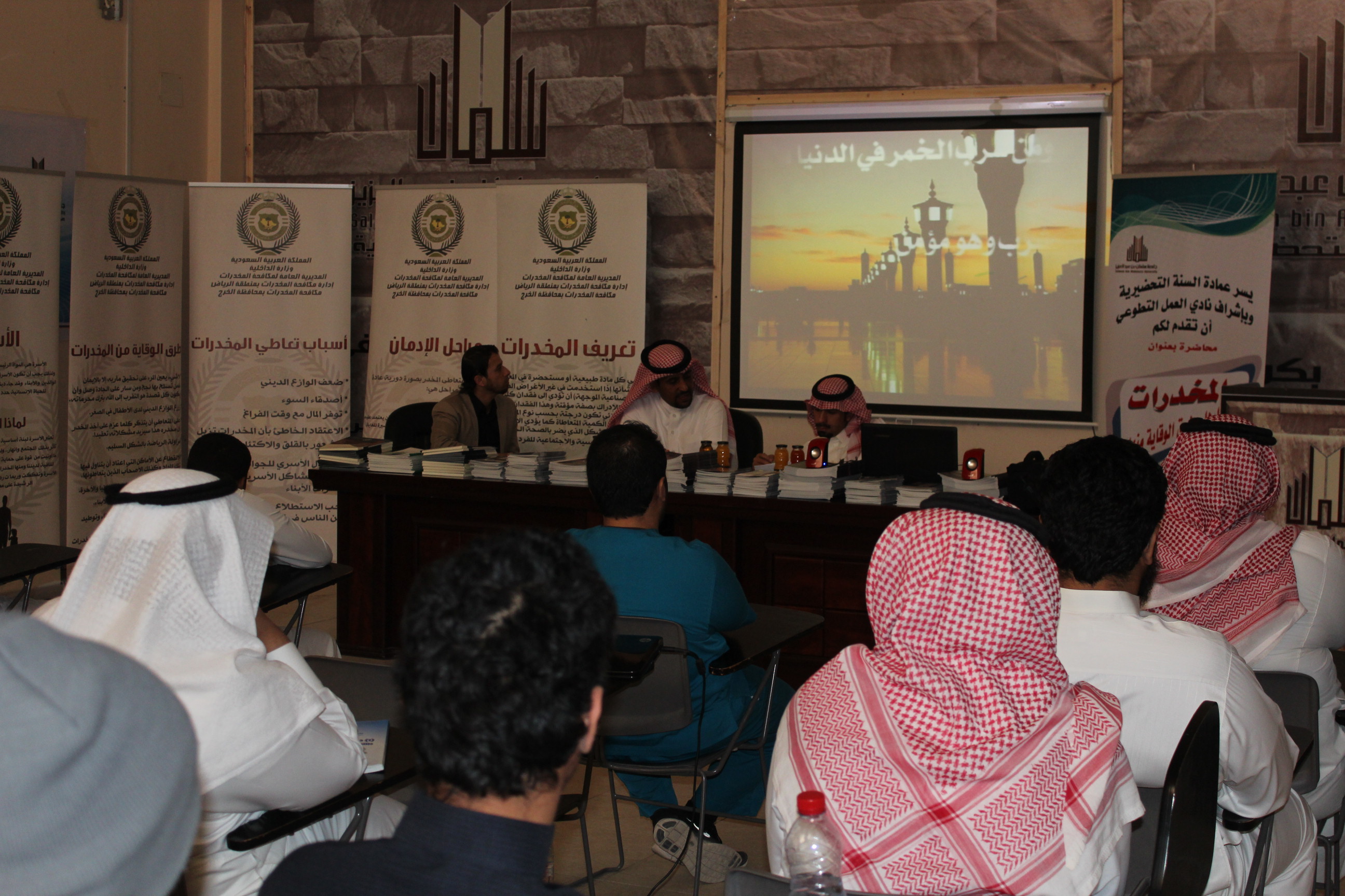 ضمن برامج نادي العمل التطوعي وتحت رعاية عميد السنة التحضيرية د. مشاري بن عياد العصيمي، وبالتعاون مع شعبة مكافحة المخدرات بالخرج ، أقامت العمادة يوم الإثنين: 4 – 5 – 1436هـ محاضرة بعنوان "المخدرات ؛ أضرارها وطرق الوقاية منها " بهدف توعية الطلاب بخطورة هذه الآفة على الفرد والمجتمع ، والتعاون في الحد من انشارها .