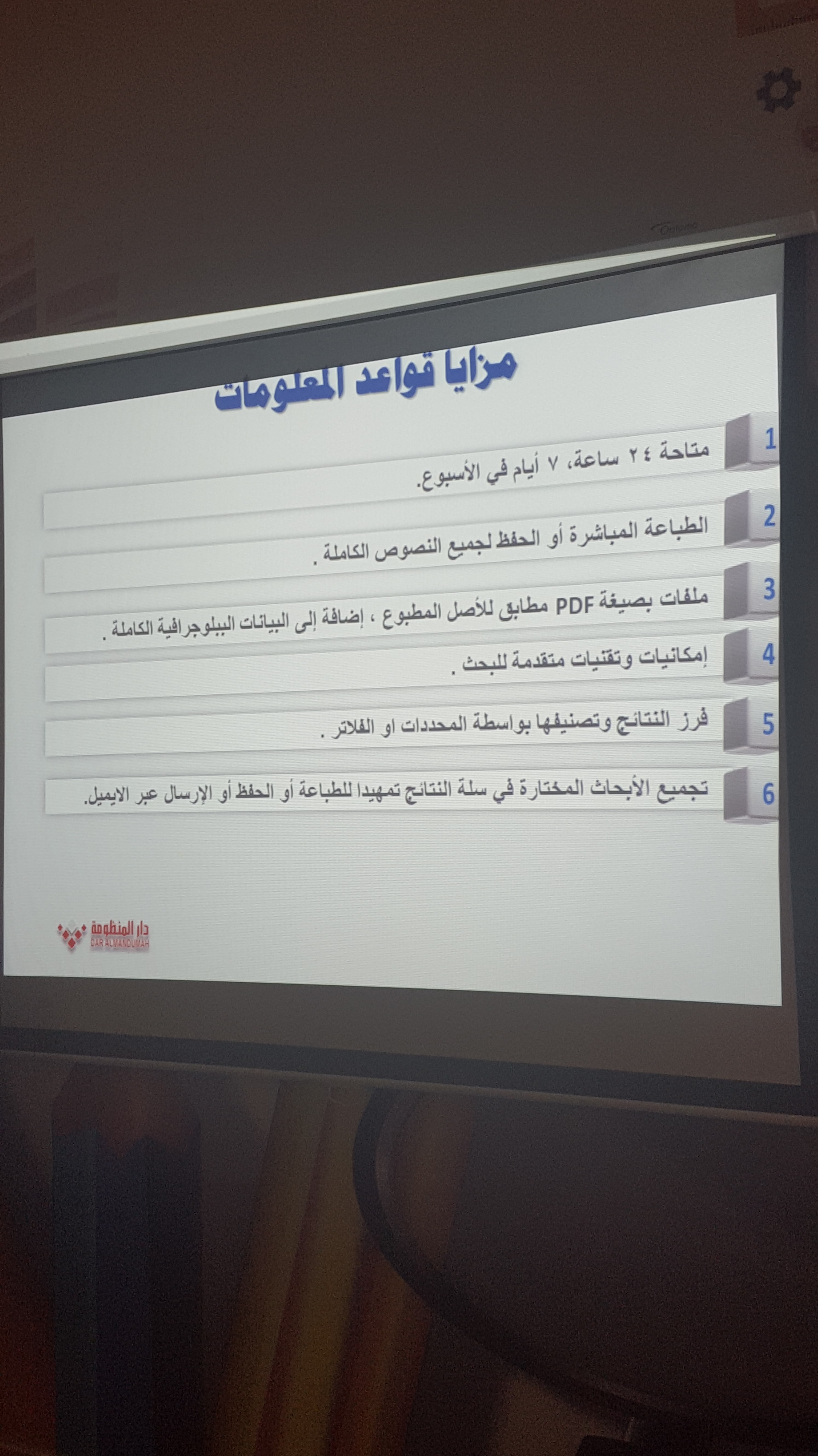 تحدثت المدربة عن دار المنظومة وعن الإتفاقيات التي عُقدت مع الأكاديميين والناشرين وجمعيات النشر العربي. ثم شرحت طريقة تسجيل الدخول من المكتبة الرقمية السعودية والبحث من خلالها وكذلك طريقة وآلية البحث المتقدم والبسيط وكيفية تقنين عملية البحث ، ثم شرحت مزايا قواعد المعلومات وكذلك مزايا البحث المتقدم.