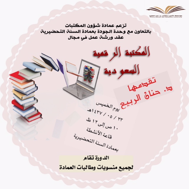 نظمت عمادة شؤون المكتبات- قسم تقنية المعلومات بالتعاون مع لجنة العلاقات العامة في عمادة السنة التحضيرية في يوم الخميس الموافق 23-5-1437 هـ ، ورشة عمل في مجال المكتبة الرقمية السعودية والتي قدمتها الأستاذة حنان بنت عبدالمحسن الربيّع المدربة في المركز الوطني للتعلم الإلكتروني للتعليم عن بعد والمتعاونة مع دار المنظومة.