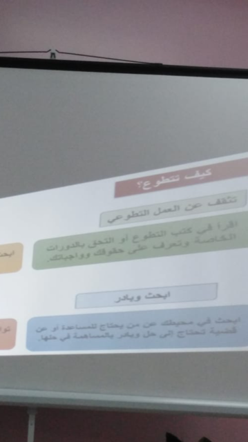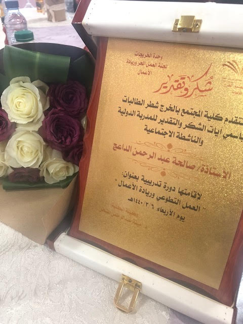 تحت رعاية سعادة وكيلة كلية المجتمع الدكتورة/ أمينة عبدالرحمن المشحن . وبإشراف الأستاذة /رفيدة قمر الدولة محمد . استضافت الكلية يوم الأربعاء الموافق 6/3/1440هـ الناشطة الاجتماعية والمدربة الدولية الأستاذة/ صالحة عبدالرحمن الداعج . وذلك لإقامة دورة تدريبية بعنوان " العمل التطوعي وريادة الأعمال " وقد تناولت في مقدمتها الأستاذة صالحة الداعج التعريف بالعمل التطوعي وأساليب التطوير فيه وكيف يمكن ان يستفيد المجتمع والوطن من الأعمال التطوعية الشبابية على الصعيد الفردي والمؤسسي تناولت بعدها تعريف بريادة الأعمال ومن هو رائد الأعمال وكيف ننمي الأفكار الريادية ونبدع ونبتكر لنصل للقمة وقد شاركت الطالبات بالمناقشة حول مفاهيم ريادة الأعمال وتطوير الذات. وقد شهدت الدورة التدريبية حضور كبير من جميع منسوبات الكلية.