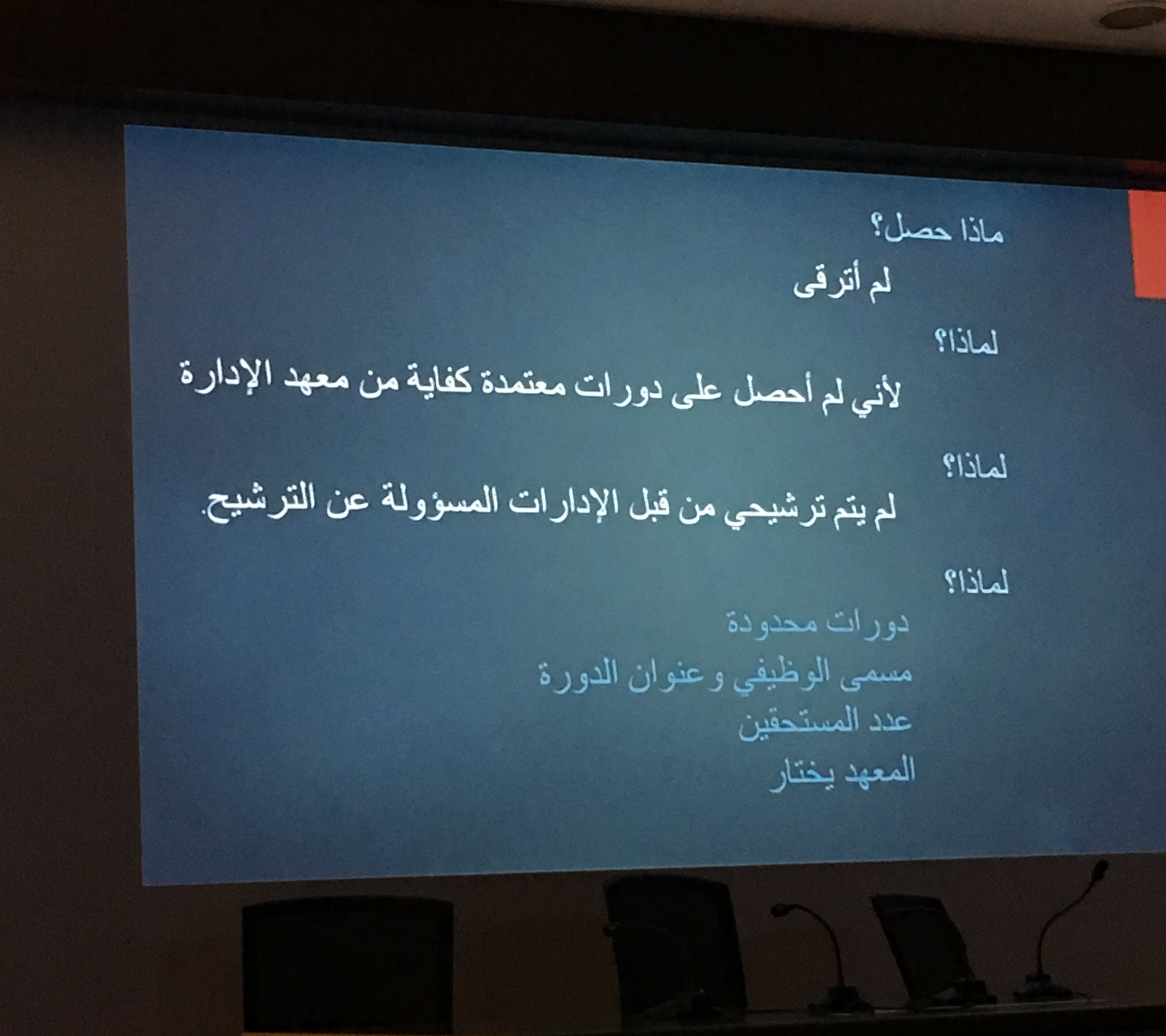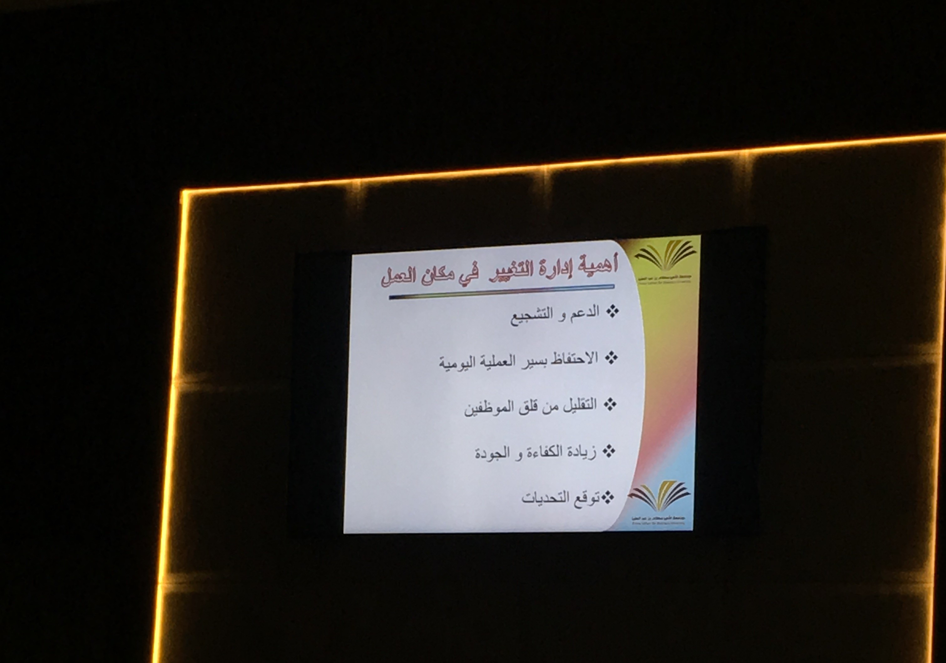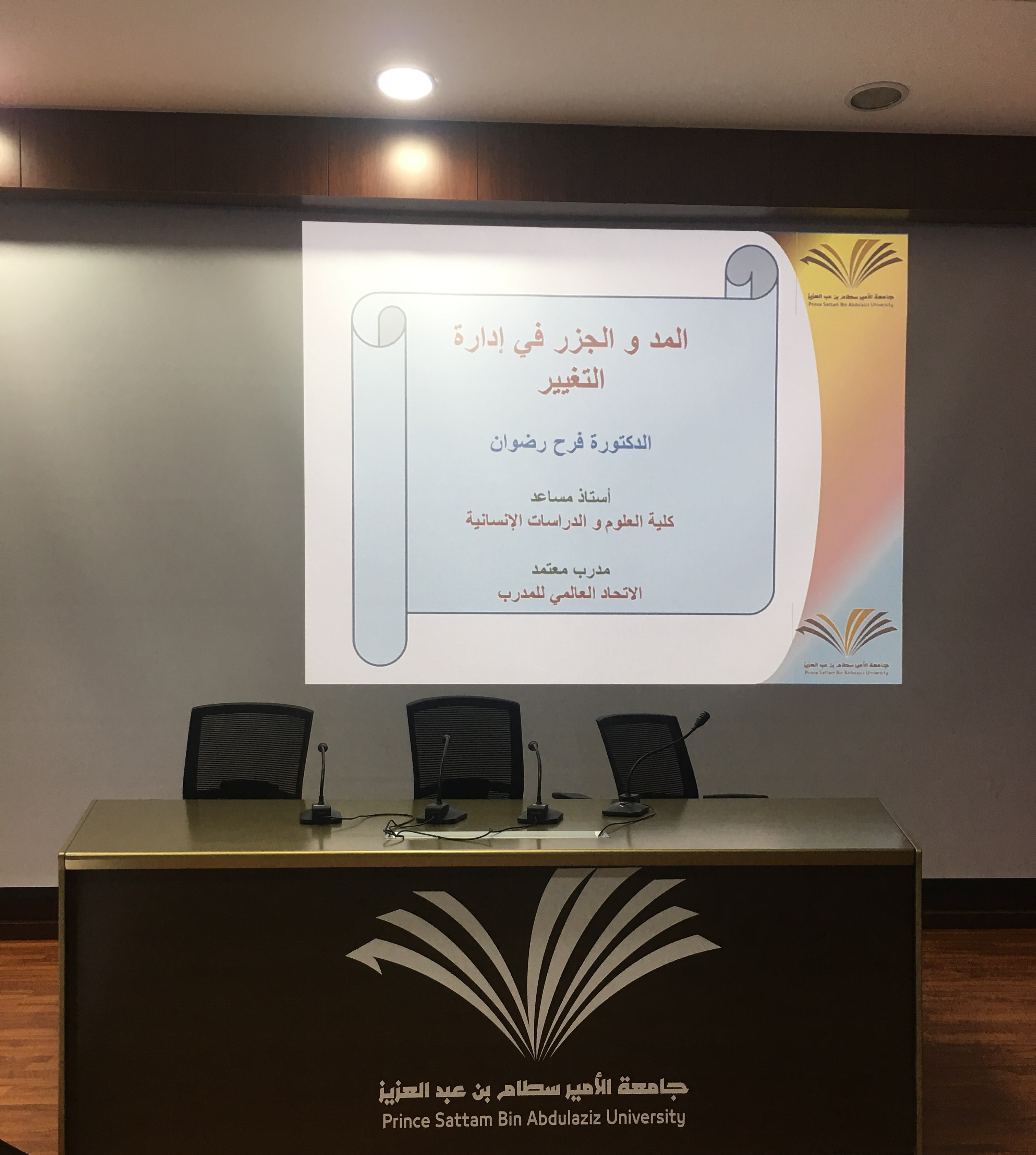 بينما طرحت د. فرح نزيه رضوان موضوع بعنوان (المد والجزر في إدارة التغيير) تشرح فيه مفهوم التغيير ومراحله واستراتيجياته وأثره على بيئة العمل والتحديات المؤثرة عليه، وقد استخدمت الدكتورة الأنشطة التدريبية لإضفاء جو من المتعة والحماس بين الحضور.