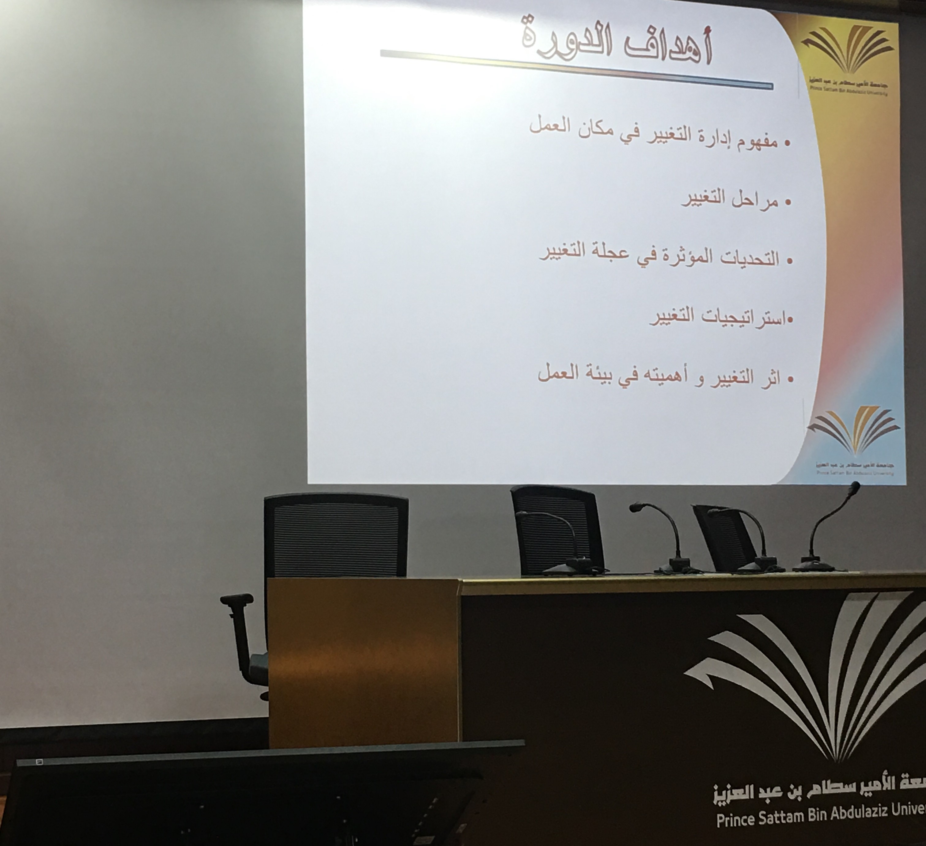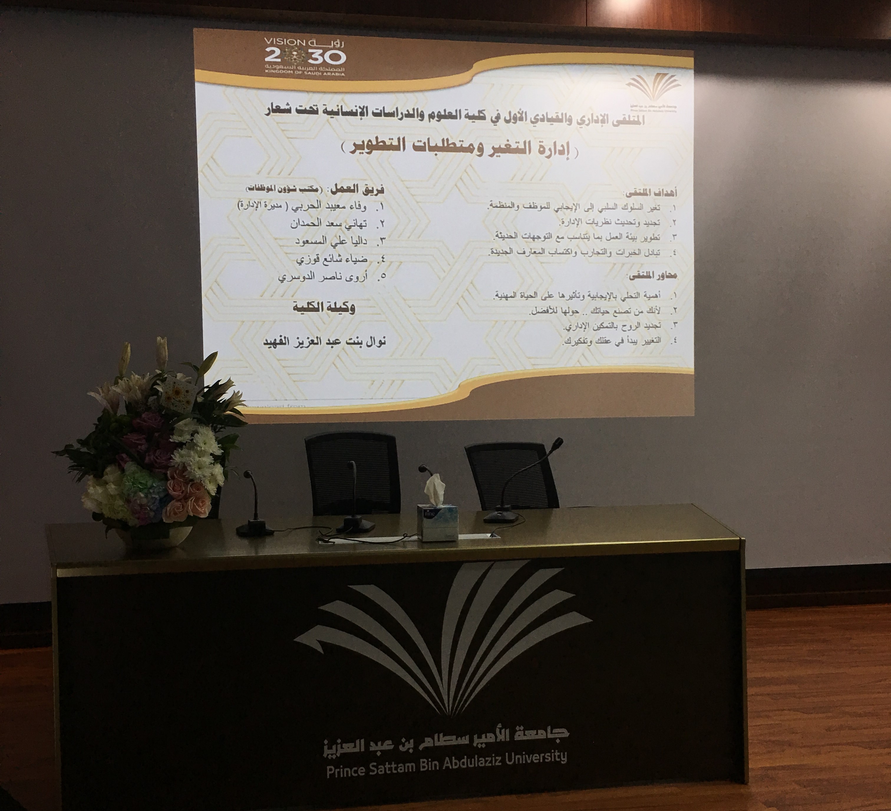 نظم مكتب شؤون الموظفات في كلية العلوم والدراسات الانسانية بالخرج (طالبات) بمسرح الكلية يوم الأحد الموافق ٢٤|٣|١٤٤٠هـ الملتقى الإداري والقيادي الأول تحت عنوان (إدارة التغيير ومتطلبات التطوير) وقد كان على شرف وكيلة الجامعة لشؤون الطالبات الدكتورة بشرى بنت أحمد الحماد وبدعم وحضور وكيلة الكلية الدكتورة نوال عبد العزيز الفهيد.