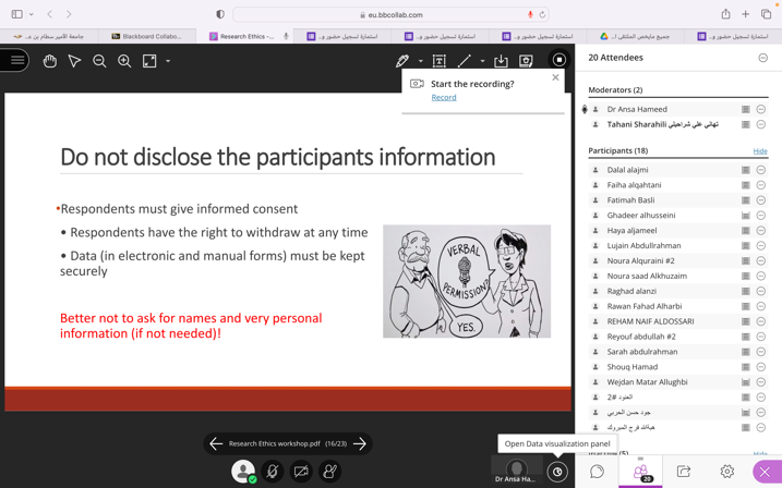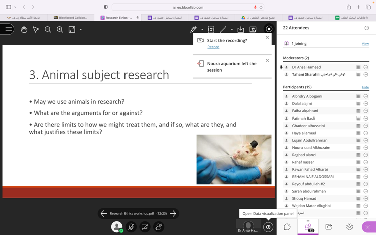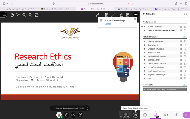 أقام الملتقى العلمي في كلية العلوم والدراسات الإنسانية بالخرج (أقسام الطالبات) ورشة تدريبية بعنوان " أخلاقيات البحث العلمي" يوم الأربعاء الموافق ٢/١١/٢٠٢٢ م قدمتها الدكتورة أنسه حميد نعمان ظهور وبإشراف الأستاذة تهاني شراحيلي للطالبات المشاركات في الملتقى العلمي من قسم اللغة الإنجليزية بشكل خاص ولطالبات الكلية بشكل عام، عبر البلاك بورد من الساعة 6-7 مساءًا.