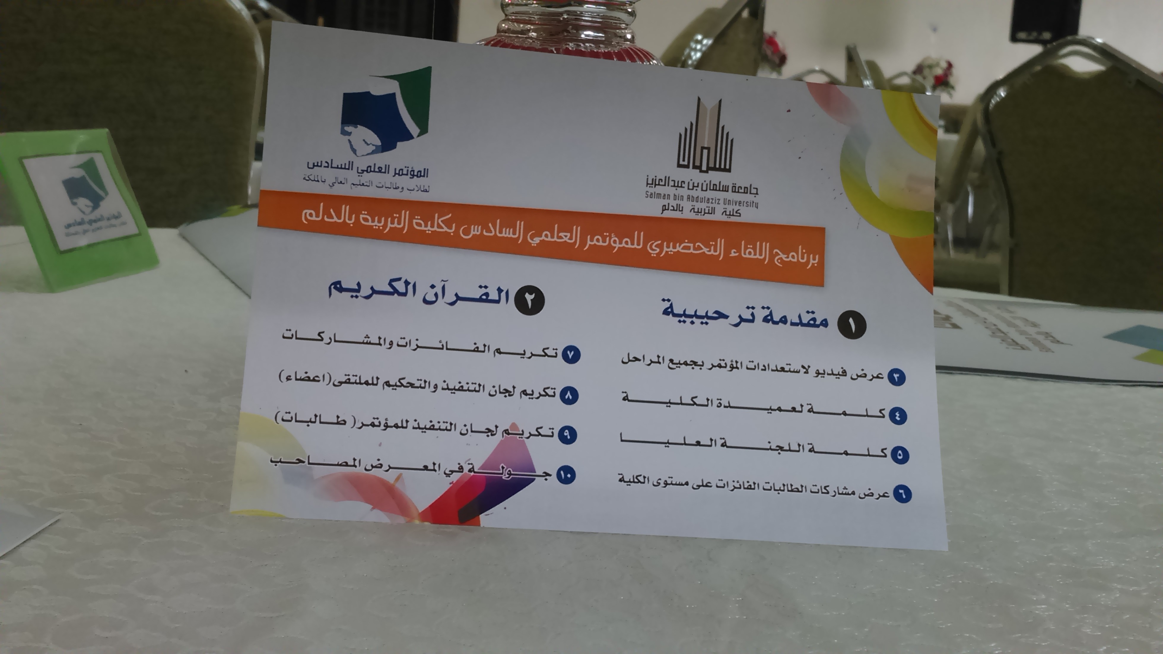 نظمت كلية التربية بالدلم الملتقي التحضيري للمؤتمر العلمي السادس لطلاب وطالبات التعليم العالي يوم الثلاثاء 24/2 الساعة العاشرة صباحاً تحت رعاية عميدة الكلية د.حنان مانع الجهني وبحضور د.نورة الزعاقي مستشارة معالي مدير الجامعة و د.دلال المطرفي وكيلة عمادة شؤون الطلاب والطلبات وعضو اللجنة العليا للمؤتمر و د. إيمان أبو سليم مشرفة العمل الطلابي بعمادة شؤون الطلاب والطالبات وعضو اللجنة العليا للمؤتمر .