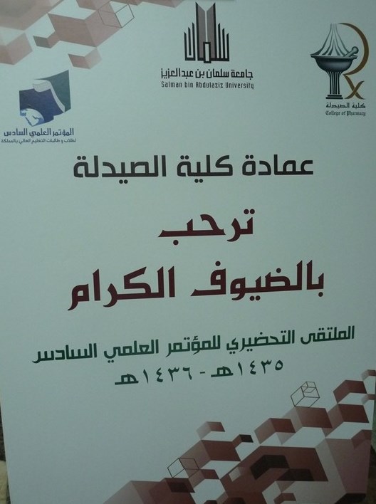 اأقامت كلية الصيدلة مسابقة الملتقى التحضيري للمؤتمر العلمي السادس لطلاب وطالبات الجامعات السعودية في كلية الصيدلة بحضور عميد الكلية وعميد شؤون الطلاب ووكيل عمادة شؤون الطلاب والأمين العام للمؤتمر ووكيل الكلية للشؤون الأكاديمية ومساعد عميد شؤون الطلاب مع لفيف من أعضاء هيئة التدريس والطلبة و تضمن الحفل كلمة عميد الكلية وكلمة عميد شؤون الطلاب وتلاها عرض للأبحاث الطلابية المشاركة في المؤتمر وعرض أيضا لمشاريع التخرج البحثية للطلاب وقد تم تقييم الأبحاث بعد الاستعانة بلجنة تحكيم من أعضاء هيئة التدريس بالكلية، وتبعها توزيع شهادات تقدير وجوائز على أصحاب المشاركات الفائزة وكذلك شهادات تقدير للمشاركين من أعضاء هيئة التدريس والموظفين وتوزيع شهادات ودروع تذكارية لعميد شؤون الطلاب ووكيل عمادة شؤون الطلاب والأمين العام للمؤتمر ووكيل الكلية للشؤون الأكاديمية ومساعد عميد شؤون الطلاب ومنسق المؤتمر لكلية الصيدلة الدكتور مؤيد حسين الخطايبة.